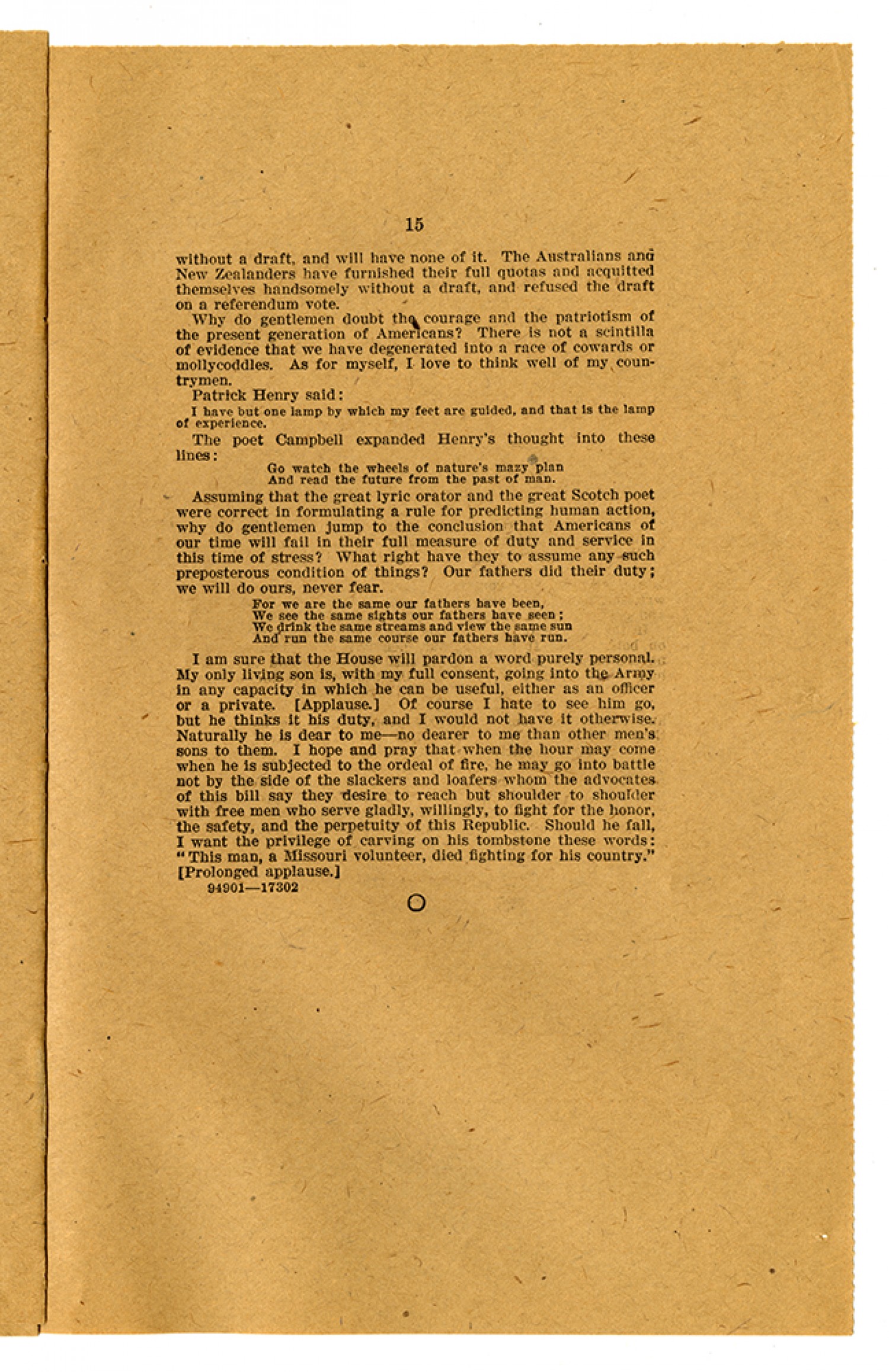 [page 15] without a draft, and will have none of it. The Australians and New Zealanders have furnished their full quotas and acquitted themselves handsomely without a draft, and refused the draft on a referendum vote. Why do gentlemen doubt the courage and the patriotism of the present generation of Americans? There is not a scintilla of evidence that we have degenerated into a race of cowards or mollycoddles. As for myself, I love to think well of my countrymen. Patrick Henry said: I have but one lamp by which my feet are guided, and that is the lamp of experience. The poet Campbell expanded Henry’s thought into these lines: Go watch the wheels of nature’s mazy plan And read the future from the past of man. Assuming that the great lyric orator and the great Scotch poet were correct in formulating a rule for predicting human action, why do gentlemen jump to the conclusion that Americans of our time will fail in their full measure of duty and service in this time of stress? What right have they to assume any such preposterous condition of things? Our fathers did their duty; we will do ours, never fear. For we are the same our fathers have been, We see the same sights our fathers have seen; We drink the same streams and view the same sun And run the same course our fathers have run. I am sure that the House will pardon a word purely personal. My only living son is, with my full consent, going into the Army in any capacity in which he can be useful, either as an officer or a private. (Applause.) Of course I hate to see him go, but he thinks it his duty, and I would not have it otherwise. Naturally he is dear to me - no dearer to me than other men’s sons to them. I hope and pray that when the hour may come when he is subjected to the ordeal of fire, he may go into battle not by the side of the slackers and loafers whom the advocates of this bill say they desire to reach but shoulder to shoulder with free men who serve gladly, willingly, to fight for the honor, the safety, and the perpetuity of this Republic. Should he fall, I want the privilege of carving on his tombstone these words: “This man, a Missouri volunteer, died fighting for his country.” (Prolonged applause.)