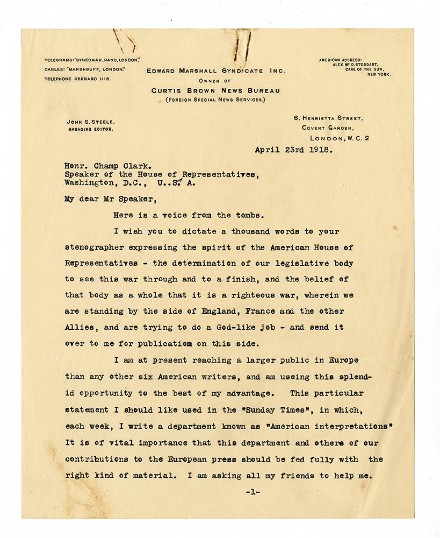 April 23rd, 1918. Honr. Champ Clark. Speaker of the House of Representatives, Washington, D.C., U..S. A. My dear Mr Speaker, Here is a voice from the tombs. I wish you to dictate a thousand words to your stenographer expressing the spirit of the American House of Representatives - the determination of our legislative body to see this war through and to a finish, and the belief of that body as a whole that it is a righteous war, wherein we are standing by the side of England, France and the other Allies, and are trying to do a God-like job – and send it over to me for publication on this side. I am at present reaching a larger public in Europe than any other six American writers, and am using this splendid opportunity to the best of my advantage. This particular statement I should like used in the “Sunday Times”, in which, each week, I write a department known as “American interpretations” It is of vital importance that this department and others of our contributions to the European press should be fed fully with the right kind of material. I am asking all my friends to help me. [page 1]