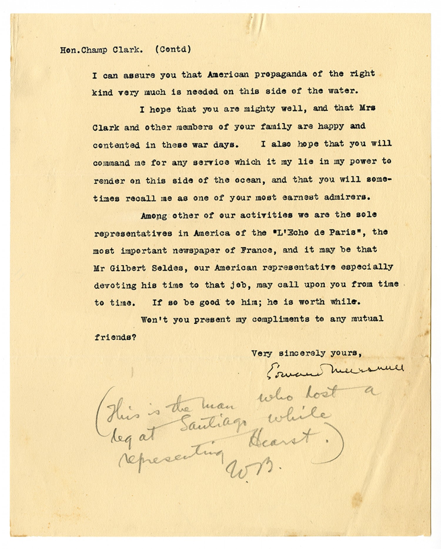 Hon. Champ Clark. (Contd) I can assure you that American propaganda of the right kind very much is needed on this side of the water. I hope that you are might well, and that Mrs Clark and other members of your family are happy and contended in these war days. I also hope that you will command me for any service which it my lie in my power to render on this side of the ocean, and that you will some-times recall me as one of your most earnest admirers. Among other of our activities we are the sole representatives in America of the “L’Echo de Paris”, the most important newspaper of France, and it may be that Mr Gilbert Seldes, our American representative especially devoting his time to that job, may call upon you from time to time. If so be good to him; he is worth while. Won’t you present my compliments to any mutual friends? Very sincerely yours, Edward Marshall (This is the man who lost a leg at Santiago while representing Hearst. W.B.)