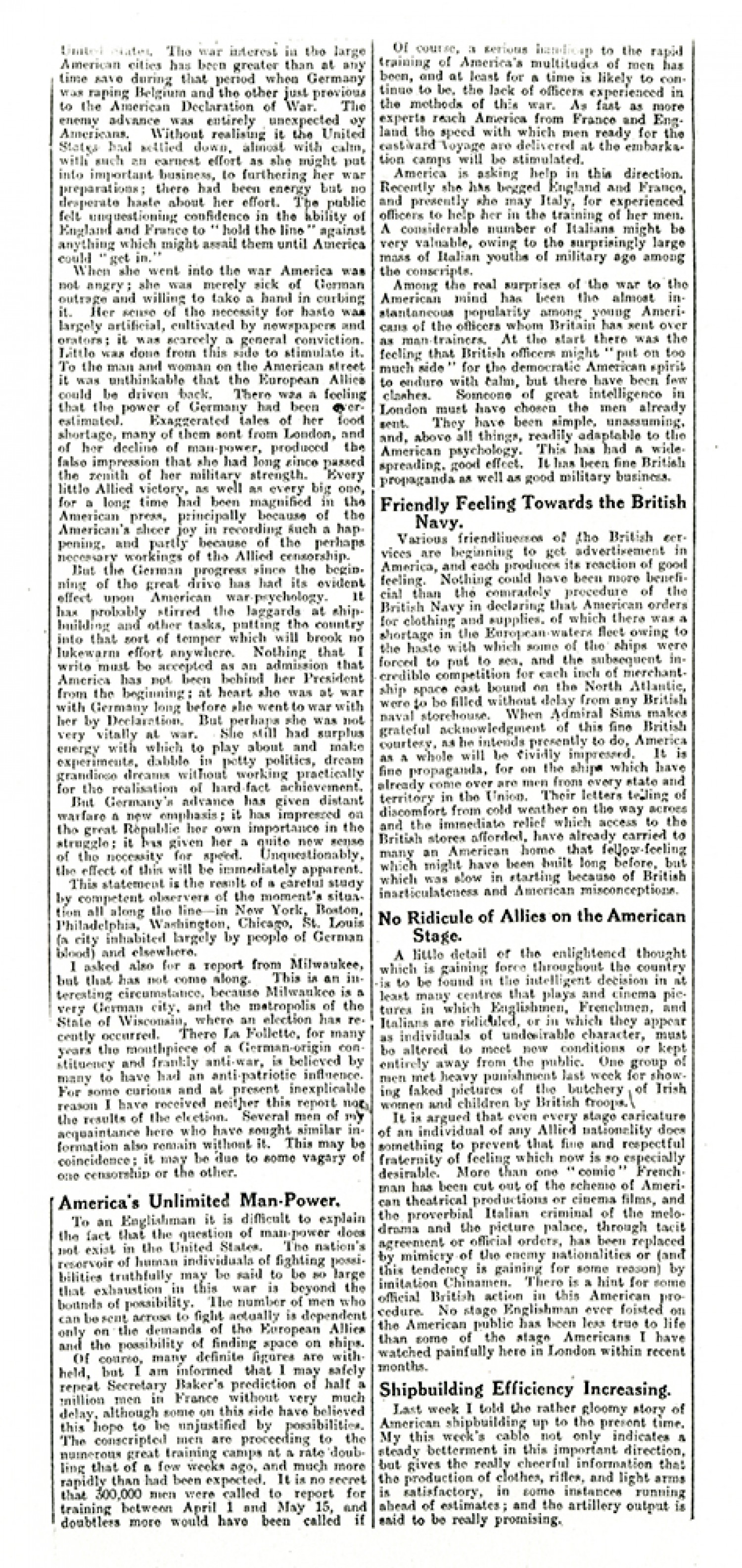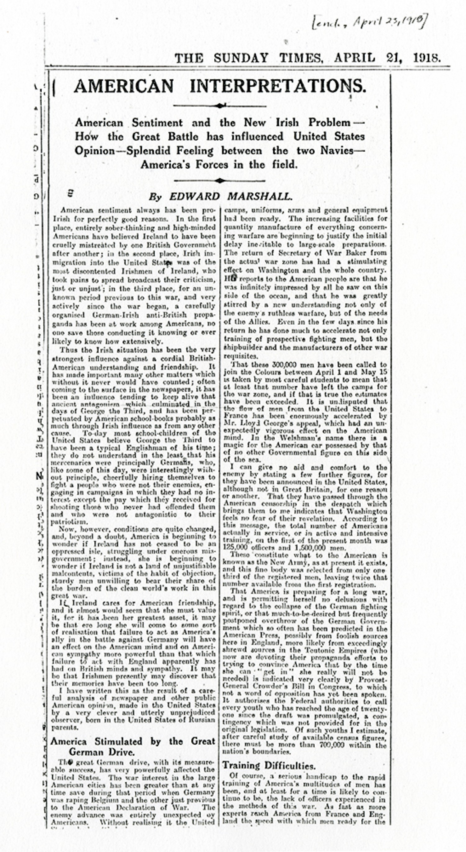 [newspaper clipping] The Sunday Times, April 21, 1918. AMERICAN INTERPRETATIONS. American Sentiment and the New Irish Problem – How the Great Battle has influenced United States Opinion – Splendid Feeling between the two Navies – America’s Forces in the field. By EDWARD MARSHALL
