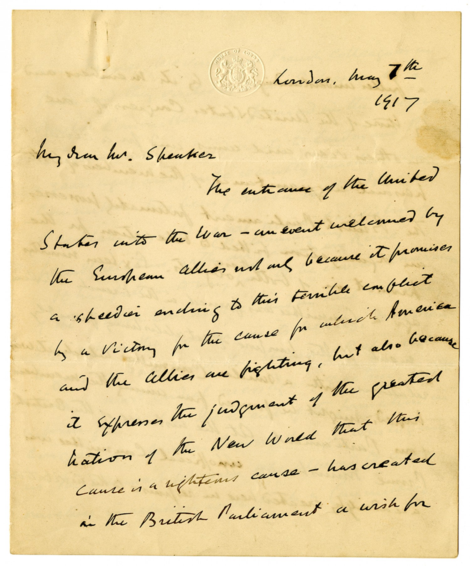 London, May 7th 1917 My Dear Mr. Speaker The entrance of the United States into the War – an event welcomed by the European allies [ms illegible: 1 wd] and because it promises a speedier ending to this terrible conflict by a victory for the cause for which America and the Allies are fighting, but also because it expresses the judgment of the greatest nation of the New World that this cause is a righteous cause – has created in the British Parliament a wish for