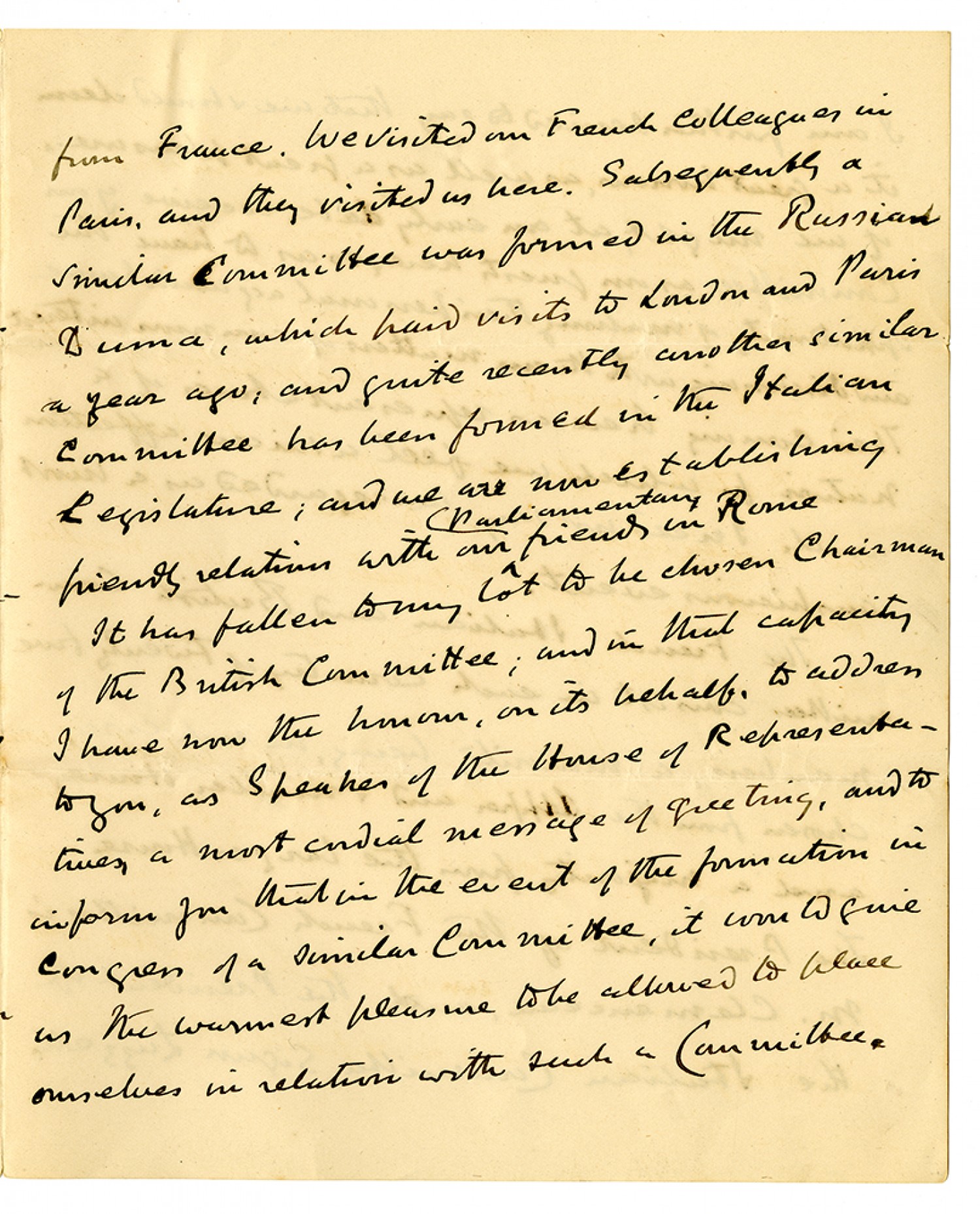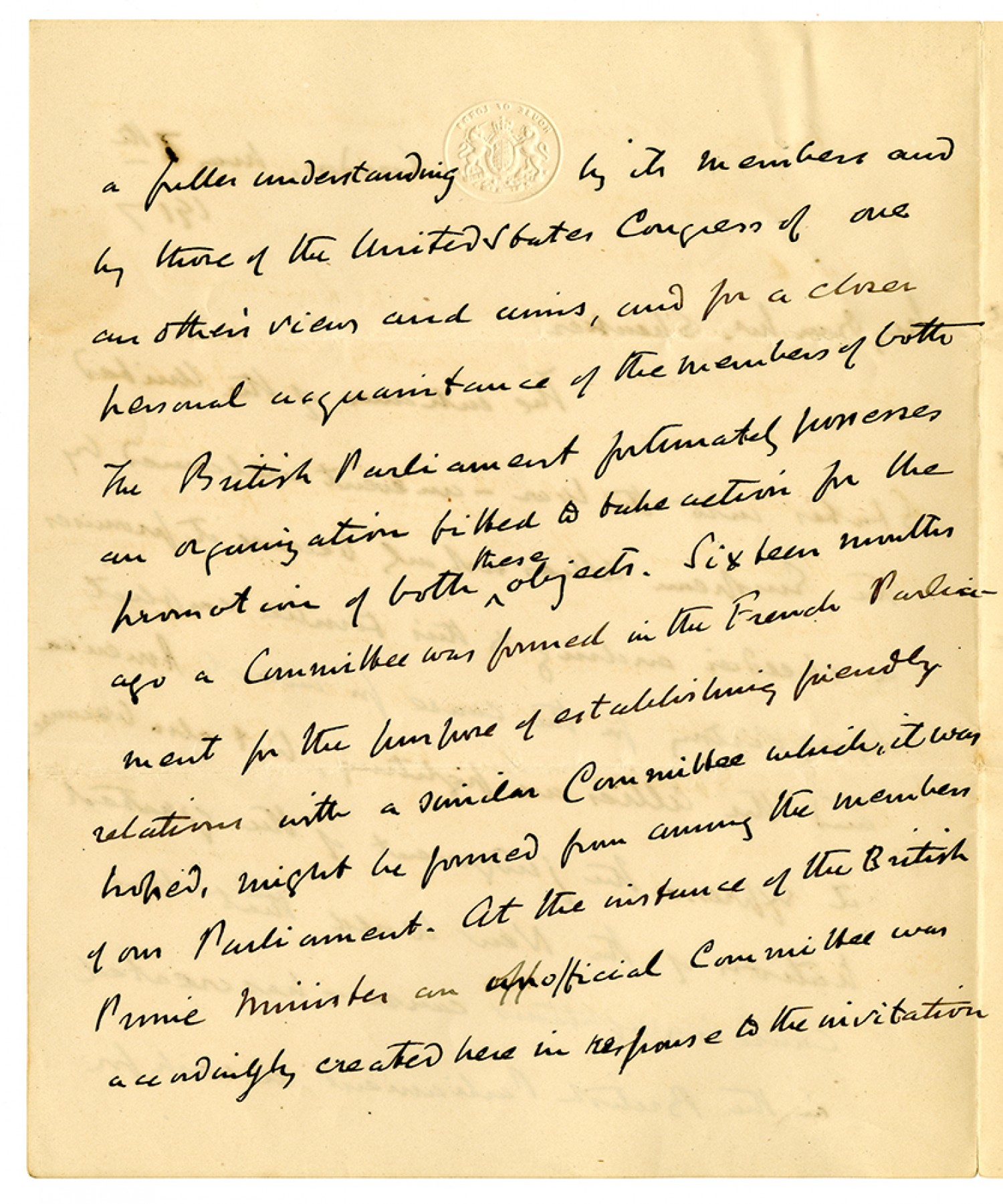 a fuller understanding by its members and by those of the United States Congress of one our [ms illegible: 1 wd] views and aims, and for a closer personal acquaintance of the members of both The British Parliament fortunately [ms illegible: 1 wd] an organization filled to take action for the [ms illegible: 1 wd] at in of both these objects. Sixteen months ago a Committee was formed in the French Parliament for the purpose of establishing friendly relations with a similar committee which, it was hoped, might be formed from among the members of our Parliament. At the entrance of the British Prime Minister an unofficial committee was accordingly created here in response to the invitation