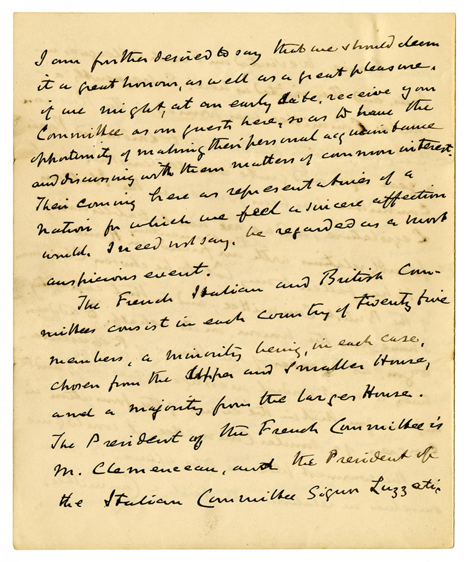 I am further derived to say that we should deem it a great honour, as well as a great pleasure, if we might, at an early date, receive your Committee as our guests here, so as to have the opportunity of making them personal acquaintance and discussing with them matters of common interest. Their coming here as representatives of a nation for which we feel a sincere affection would. I need not say, be regarded as a most auspicious event. The French Italian and British Committees consist in each country at twenty five members, a minority being, in each case, chosen from the Upper and Smaller House, and a majority from the larger House. The President of the French Committee is M. Clemenceau, and the President of the Italian Commitee Sogun Lussatic