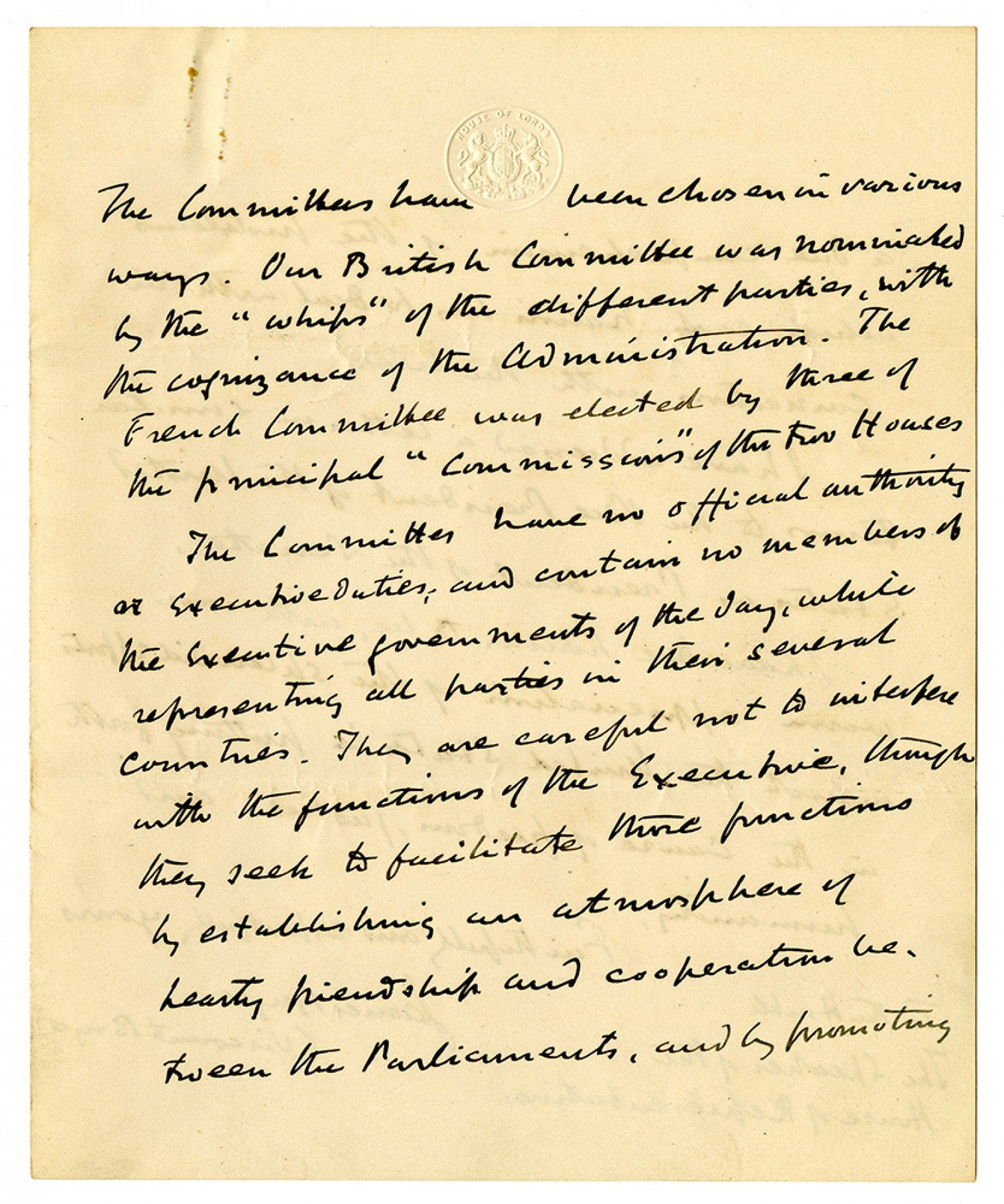 The Committees have been chosen in various ways. Our British Committee was nominated by the “whips” of the different parties, with the cognizance of the Administration. The French Committee was elected by three of the principal “Commissions” of the two Houses The Committes have no official authority or Executive Duties, and contain no members of his Executive governments of the day, while representing all parties in their several countries. They are careful not to interfere with the functions of the Executive, though they seek to facilitate more functions by establishing an atmosphere of hearty friendship and cooperations between the Parliaments, and by promoting