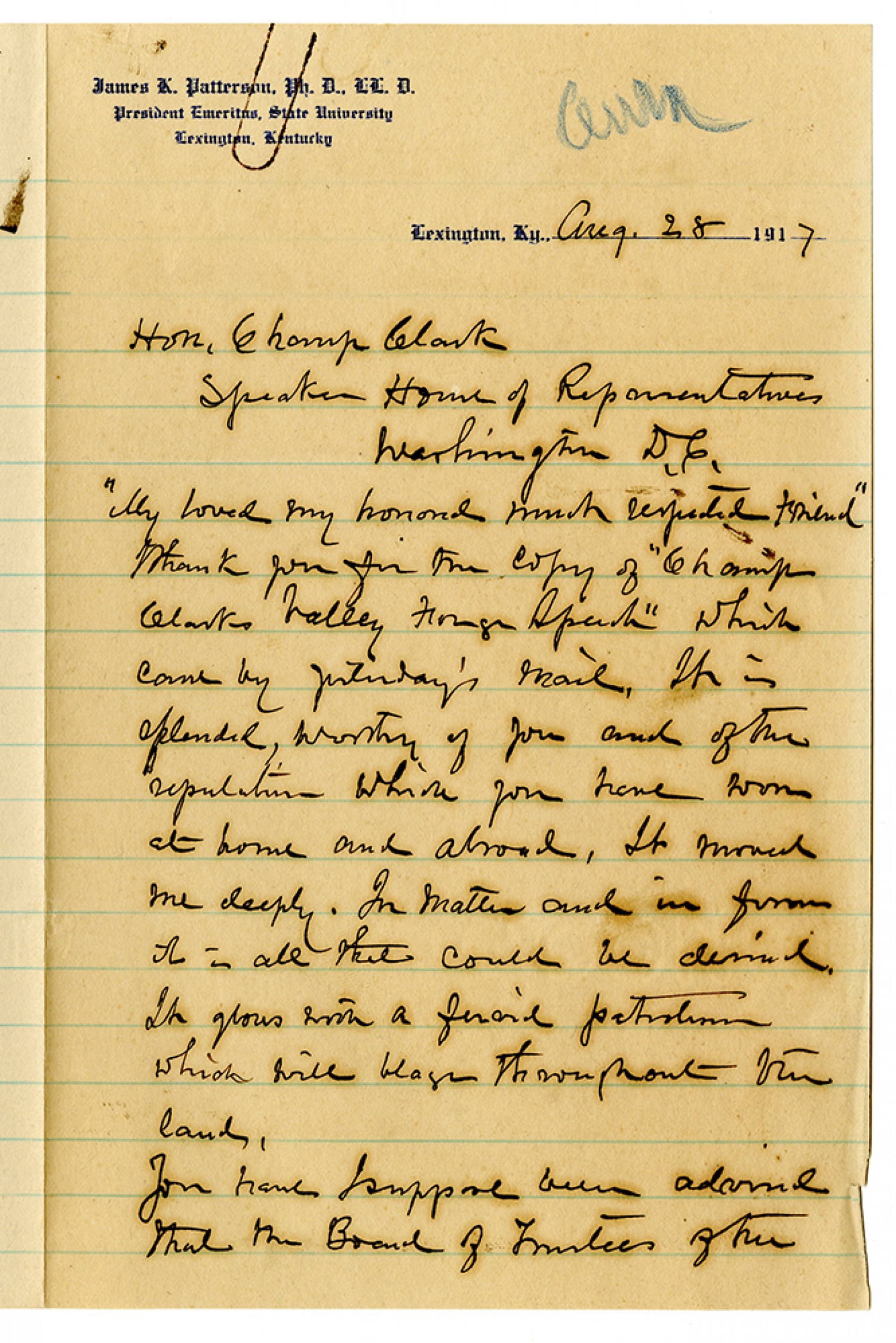 Lexington, [Kentucky] [August] 28 1917 Hon. Champ Clark Speaker House of Representatives Washington D.C. “My loved my honored much regarded friend” Thank you for the copy of “Champ” Clarks Valley through Speech” which came by yesterday’s mail. It is splendid, worthy of you and of the reputation which you have won at home and abroad. It moved me deeply. In matter and in form it is all that could be [ms illegible: 1 wd]. It glows with a [ms illegible: 2 wds] which will blaze throughout the land. You have I suppose been advised that the Board of Trustees of the