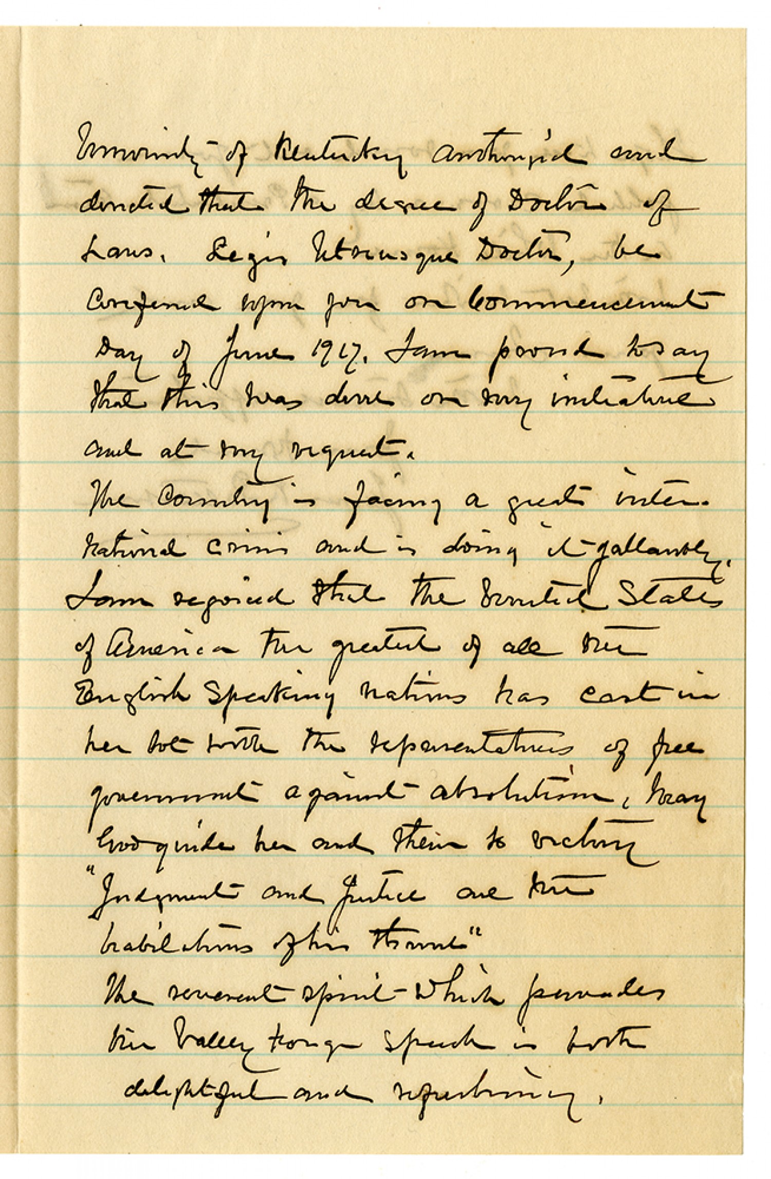 Community - of Kentucky authorized and decided that the degree of Doctors of Laws, Legis [ms illegible: 1 wd] Doctor, be conferred upon you for the Commencement Day of June 1917. I am proud to say that this was done on my initiative and at my request. The country is facing a great international crisis and is doing it gallantly. I am rejoiced that the United States of America the greatest of all our English Speaking nations has cast in her lot with the representatives of free government against absolutism, Gray Foodridge her and them to action “Judgement and justice are the [ms illegible: 1 wd] of his [ms illegible: 1 wd]” The severed spine –which pervades his valley tough speech is both delightful and refreshing.