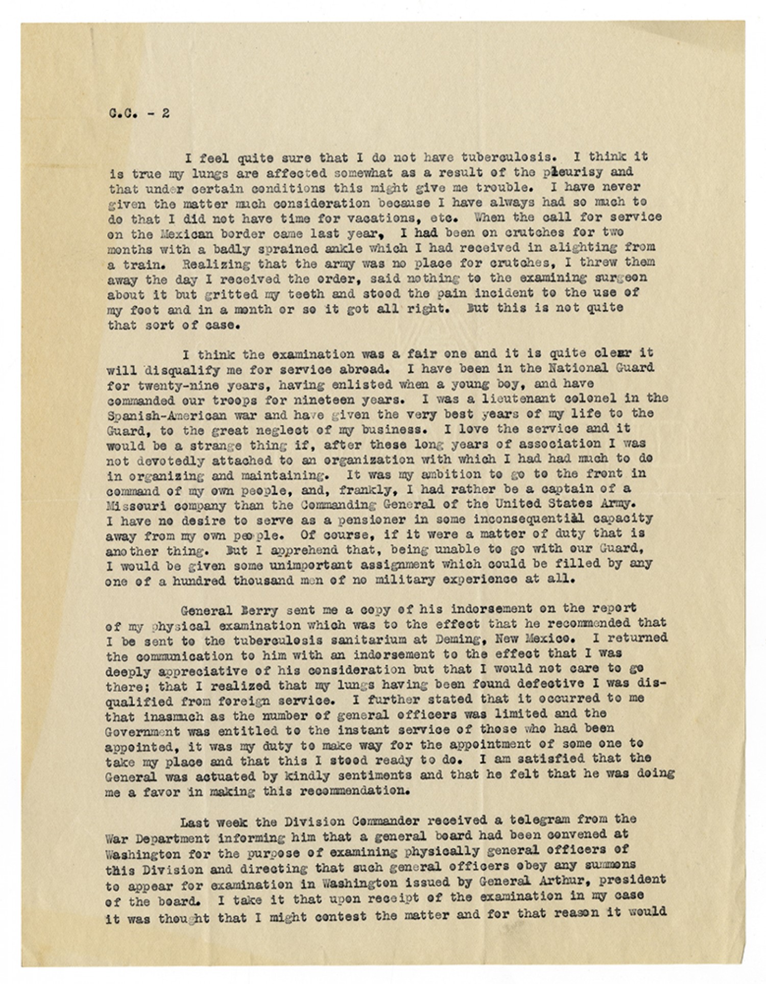 C.C. – 2 I feel quite sure that I do not have tuberculosis. I think it is true my lungs are affected somewhat as a result of the pleurisy and that under certain conditions this might give me trouble. I have never given the matter much consideration because I have always had so much to do that I did not have time for vacations, etc. When the call for service on the Mexican border came last year, I had been on crutches for two months with a badly sprained ankle which I had received in alighting from a train. Realizing that the army was no place for crutches, I threw them away the day I received the order, said nothing to the examining surgeon about it but gritted my teeth and stood the pain incident to the use of my foot and in a month or so it got all right. But this is not quite that sort of case. I think the examination was a fair one and it is quite clear it will disqualify me for service abroad. I have been in the National Guard for twenty-nine years, having enlisted when a young boy, and have commanded our troops for nineteen years. I was a lieutenant colonel in the Spanish-American war and have given the very best years of my life to the Guard, to the great neglect of my business. I love the service and it would be a strange thing if, after these long years of association I was not devotedly attached to an organization with which I had had much to do in organizing and maintaining. It was my ambition to go to the front in command of my own people, and frankly, I had rather be a captain of a Missouri company than the Commanding General of the United States Army. I have no desire to serve as a pensioner in some inconsequential capacity away from my own people. Of course, if it were a matter of duty that is another thing. But I apprehend that, being unable to go with our Guard, I would be given some unimportant assignment which could be filled by any one of a hundred thousand men of no military experience at all. General Berry sent me a copy of his endorsement on the report of my physical examination which was to the effect that he recommended that I be sent to the tuberculosis sanitarium at Deming, New Mexico. I returned the communication to him with the endorsement to the effect that I was deeply appreciative of his consideration but that I would not care to go there; that I realized that my lungs having been found defective I was disqualified from foreign service. I further stated that it occurred to me that inasmuch as the number of general officers was limited and the Government was entitled to the instant service of those who had been appointed, it was my duty to make way for the appointment of some one to take my place and that this I stood ready to do. I am satisfied that the General was actuated by kindly sentiments and that he felt that he was doing me a favor in making this recommendation. Last week the Division Commander received a telegram from the War Department informing him that a general board had been convened at Washington for the purpose of examining physically general officers of this Division and directing that such general officers obey any summons to appear for examination in Washington issued by General Arthur, president of the board. I take it that upon receipt of the examination in my case it was thought that I might contest the matter and for that reason it would