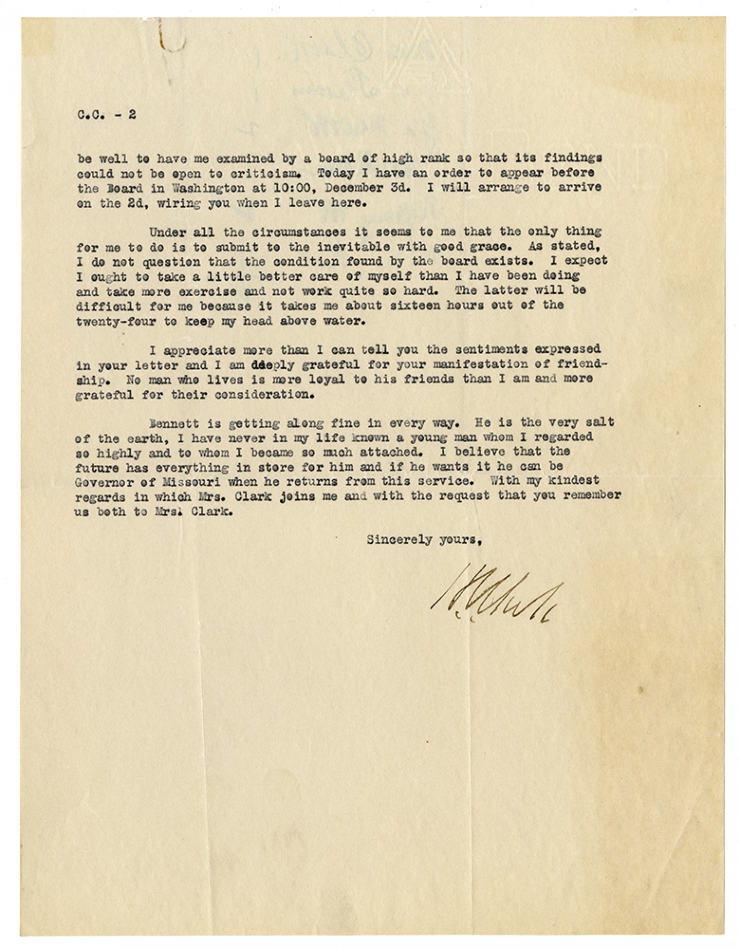 C.C. – [3] be well to have me examined by a board of high rank so that its findings could not be open to criticism. Today I have an order to appear before the board in Washington at 10:00, December 3d. I will arrange to arrive on the 2d, writing you when I leave here. Under all the circumstances it seems to me that the only thing for me to do is to submit to the inevitable with good grace. As stated, I do not question that the condition found by the board exists. I expect I ought to take a little better care of myself than I have been doing and take more exercise and not work quite so hard. The latter will be difficult for me because it takes me about sixteen hours out of the twenty-four to keep my head above water. I appreciate more than I can tell you the sentiments expressed in your letter and I am deeply grateful for your manifestation of friendship. No man who lives is more loyal to his friends than I am and more grateful for their consideration. Bennett is getting along fine in every way. He is the very salt of the earth, I have never in my life known a young man whom I regarded so highly and to whom I became so much attached. I believe that the future has everything in store for him and if he wants it he can be Governor of Missouri when he returns from this service. With my kindest regards in which Mrs. Clark joins me and with the request that you remember us both to Mrs. Clark. Sincerely yours, [ms illegible: 1 wd]