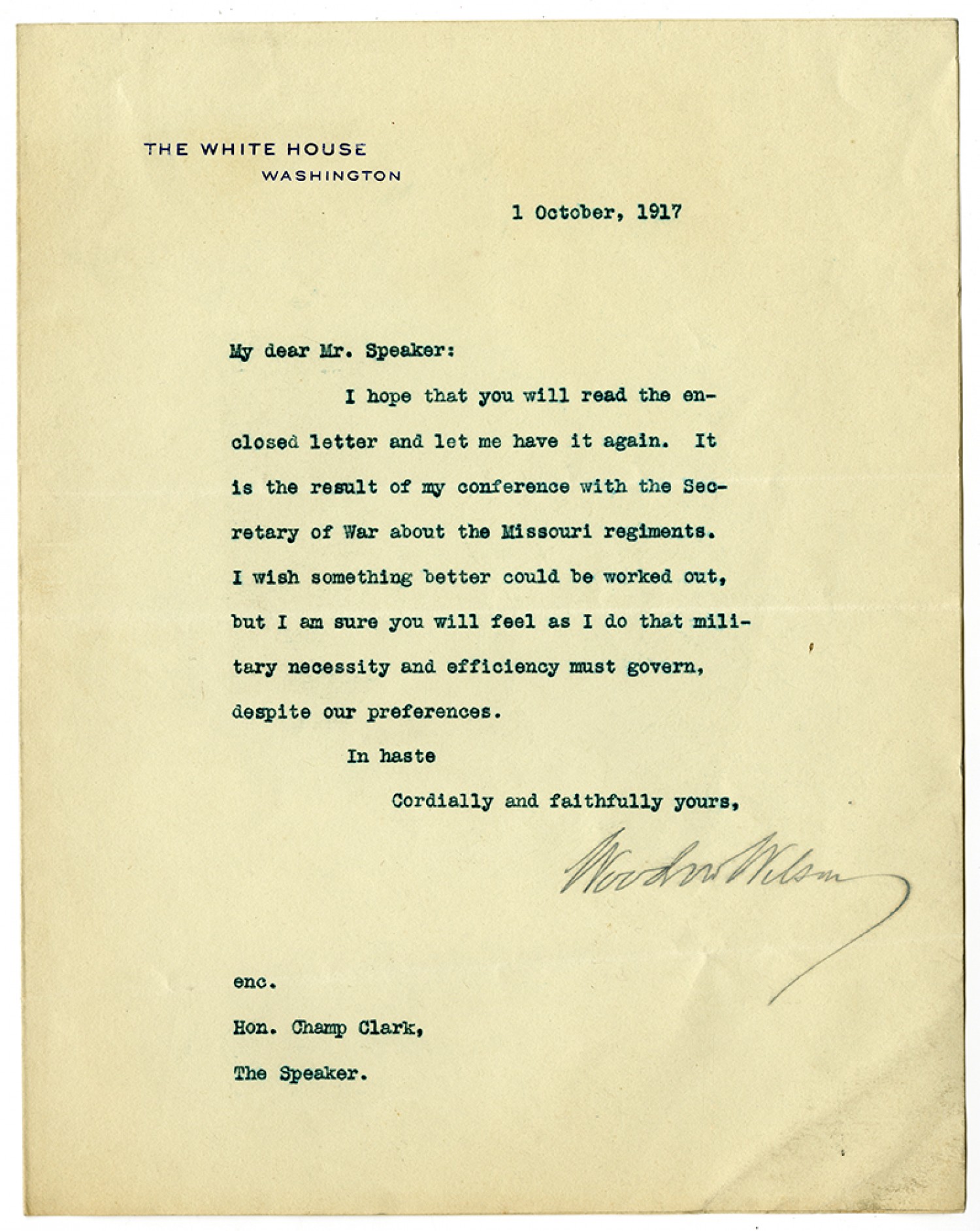 | Source | Wilson, Woodrow. Letter to Champ Clark. 1 October 1917. Clark, Champ (1850-1921) and Bennett Champ (1890-1954), Papers, 1853-1973. C0666. The State Historical Society of Missouri, Columbia, MO. |