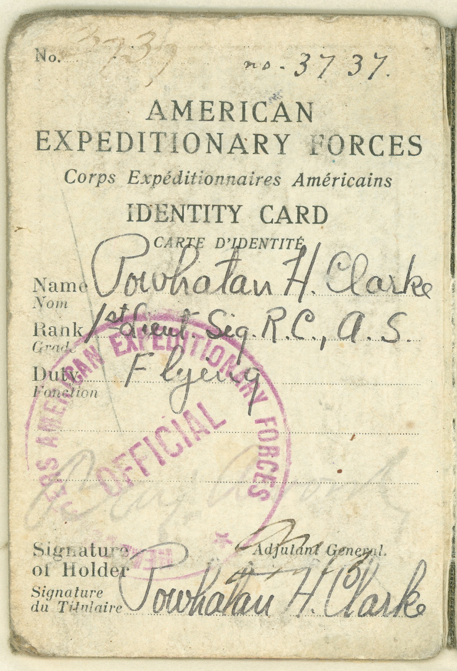 | Description | Powhatan Hughes Clarke served with the 21st Aero Squadron and the Labor Bureau A.E.F. during World War I. He died from tuberculosis August 20, 1920. This is Powhatan Clarke's American Expeditionary Forces Identity Card. |