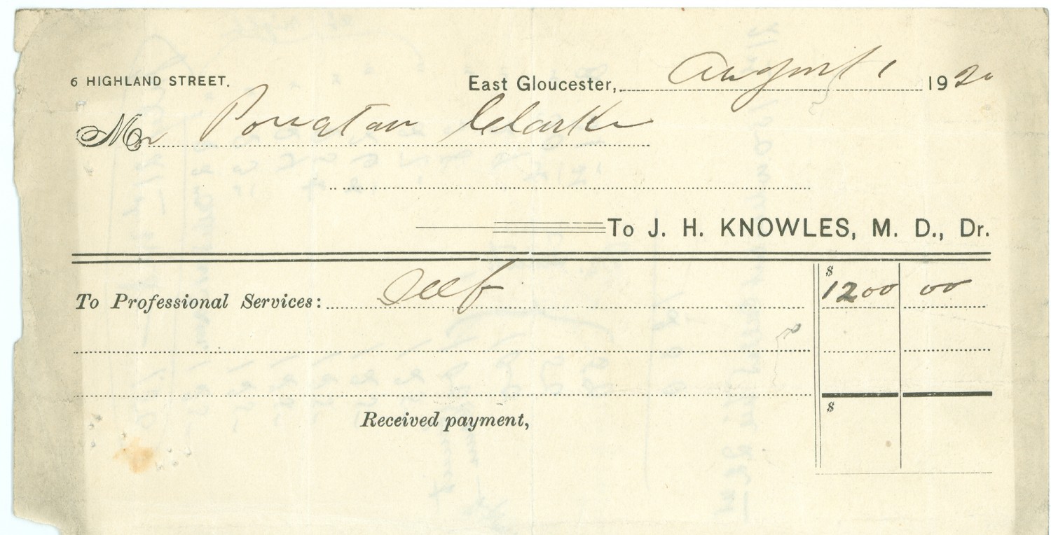 6 HIGHLAND STREET. East Gloucester, August 1, 1920 Mo Powhatan Clarke To J. H. KNOWLES, M.D., DR. To professional Services: [ms illegible: 1 wd] $1200.00 Received Payment