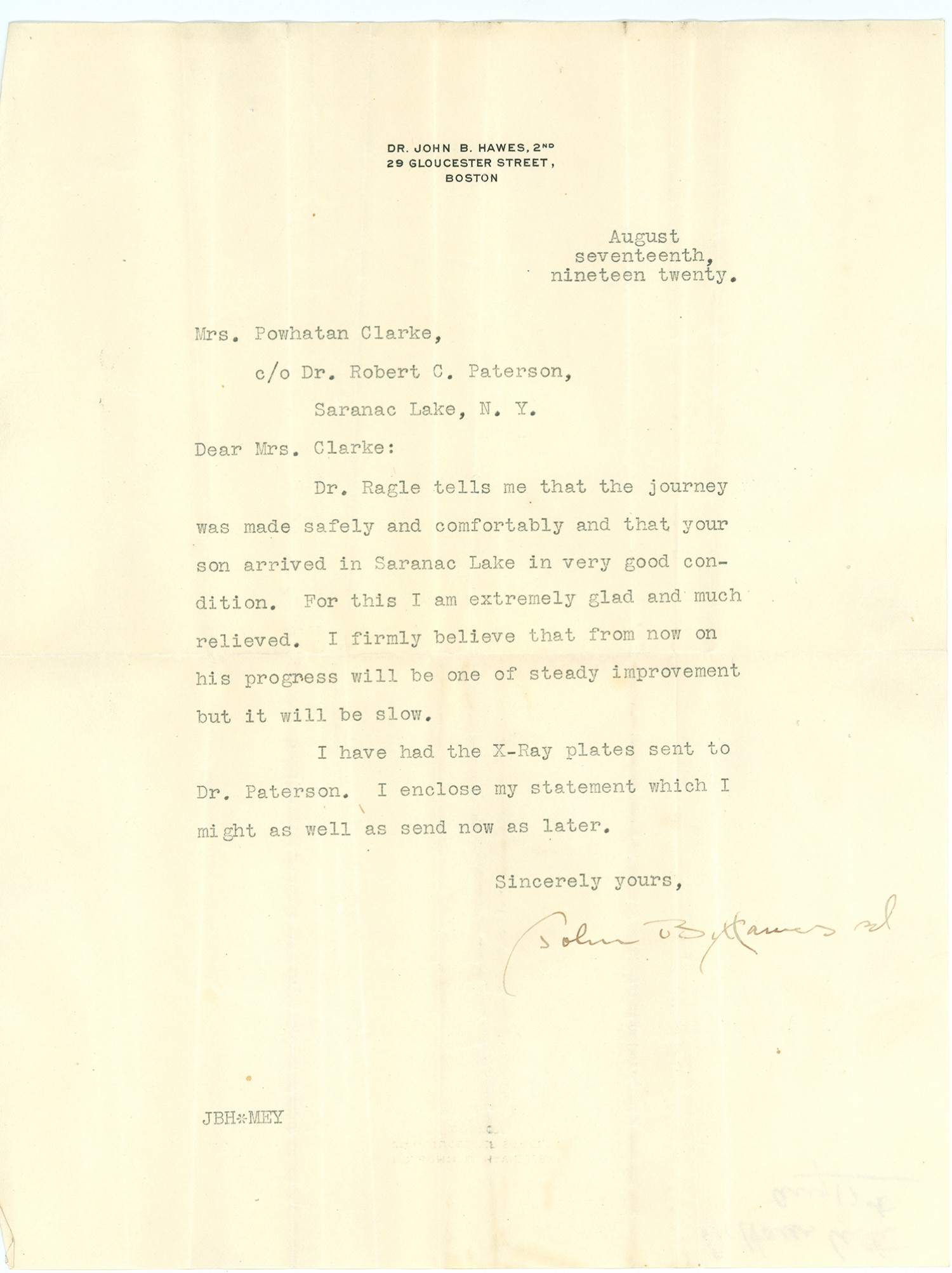 [Dr. JOHN B. HAWES, 2ND letterhead] August seventeen, nineteen twenty. Mrs. Powhatan Clarke, c/o Dr. Robert C. Paterson, Saranac Lake, [New York] Dear Mrs. Clarke: De. Ragle tells me that the journey was made safely and comfortably and that your son arrived in Saranac Lake in very good condition. For this I am extremely glad and much relieved. I firmly believe that from now on his progress will be one of steady improvement but it will be slow. I have had the X-Ray plates sent to Dr. Paterson. I enclose my statement which I might as well as send now as later. Sincerely yours, John B. Hawes md JBH*MEY
