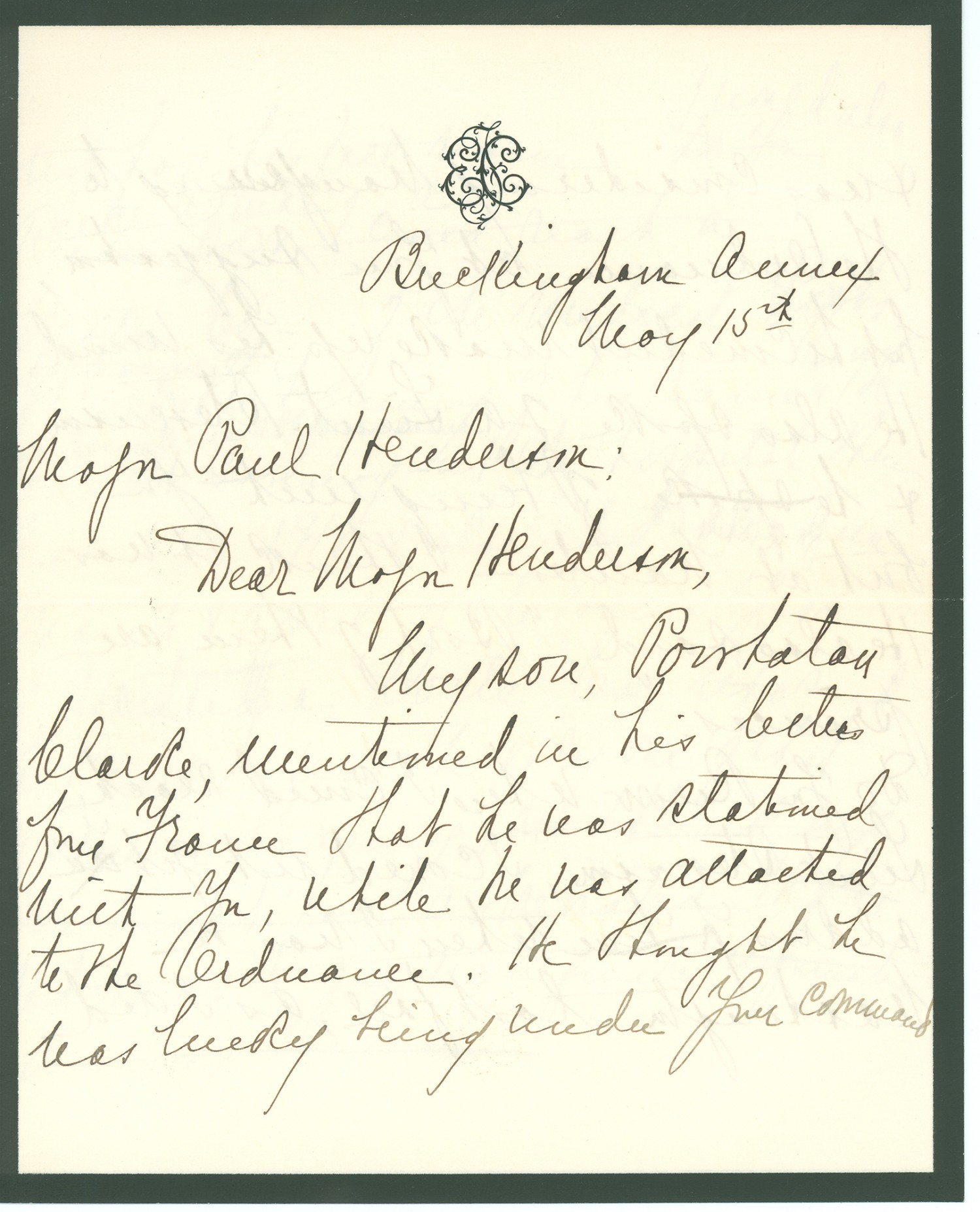 Buckingham Annex May 15th Major Paul Henderson; Dear Major Henderson, My son, Powhatan Clarke, mentioned in his letters from France that he was stationed with you, while he was attached to the Ordnance. He thought he was lucky being under your command