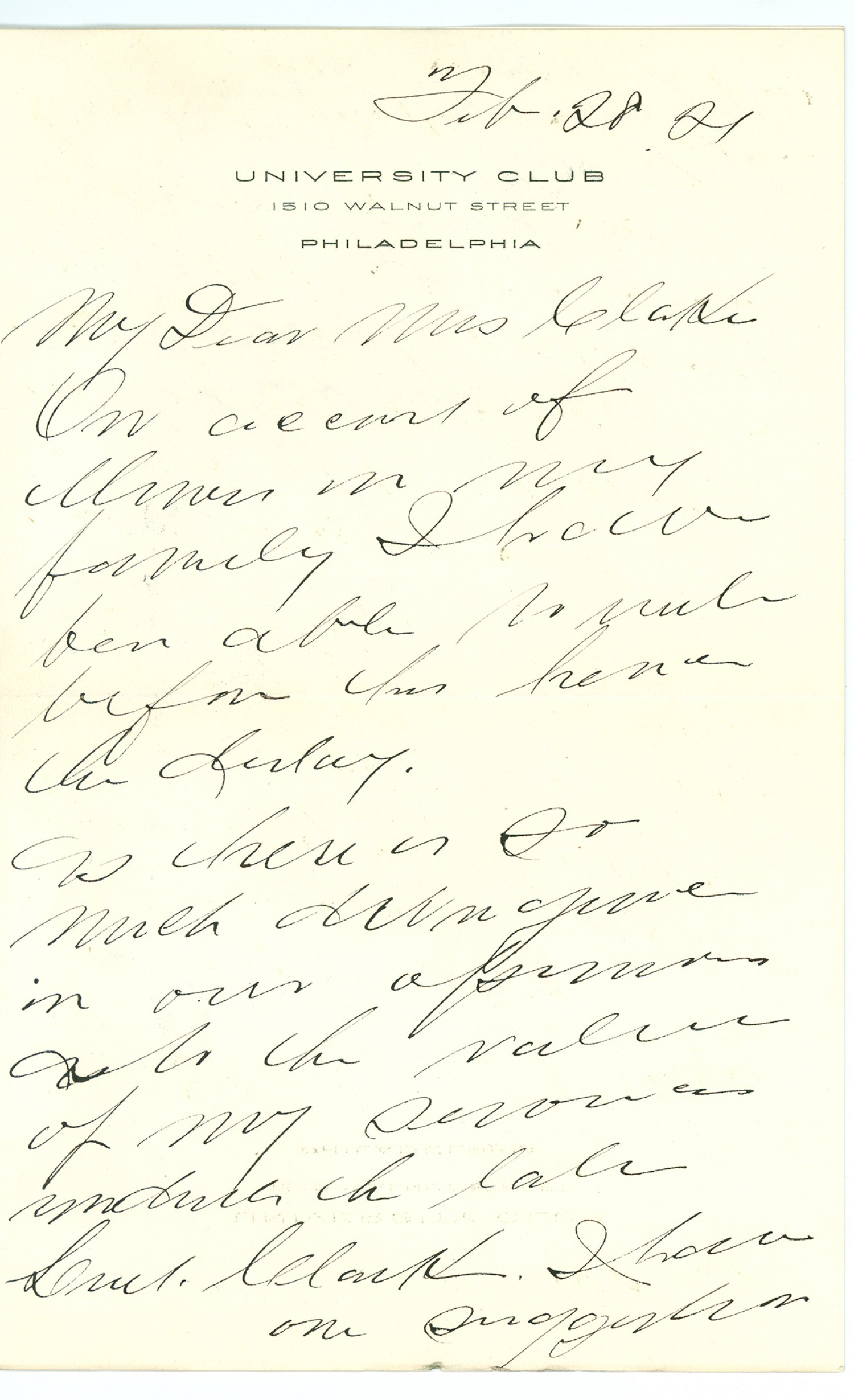 [University Club letterhead] [February] 28 [1921] My Dear Mrs Clarke On account of illness in my family I have been able to write before this hence the delay. As there is so much difference in our [ms illegible:1 wd] as to the value of my services [ms illegible: 1 wd] the late Leiut. Clark. I have one suggestion