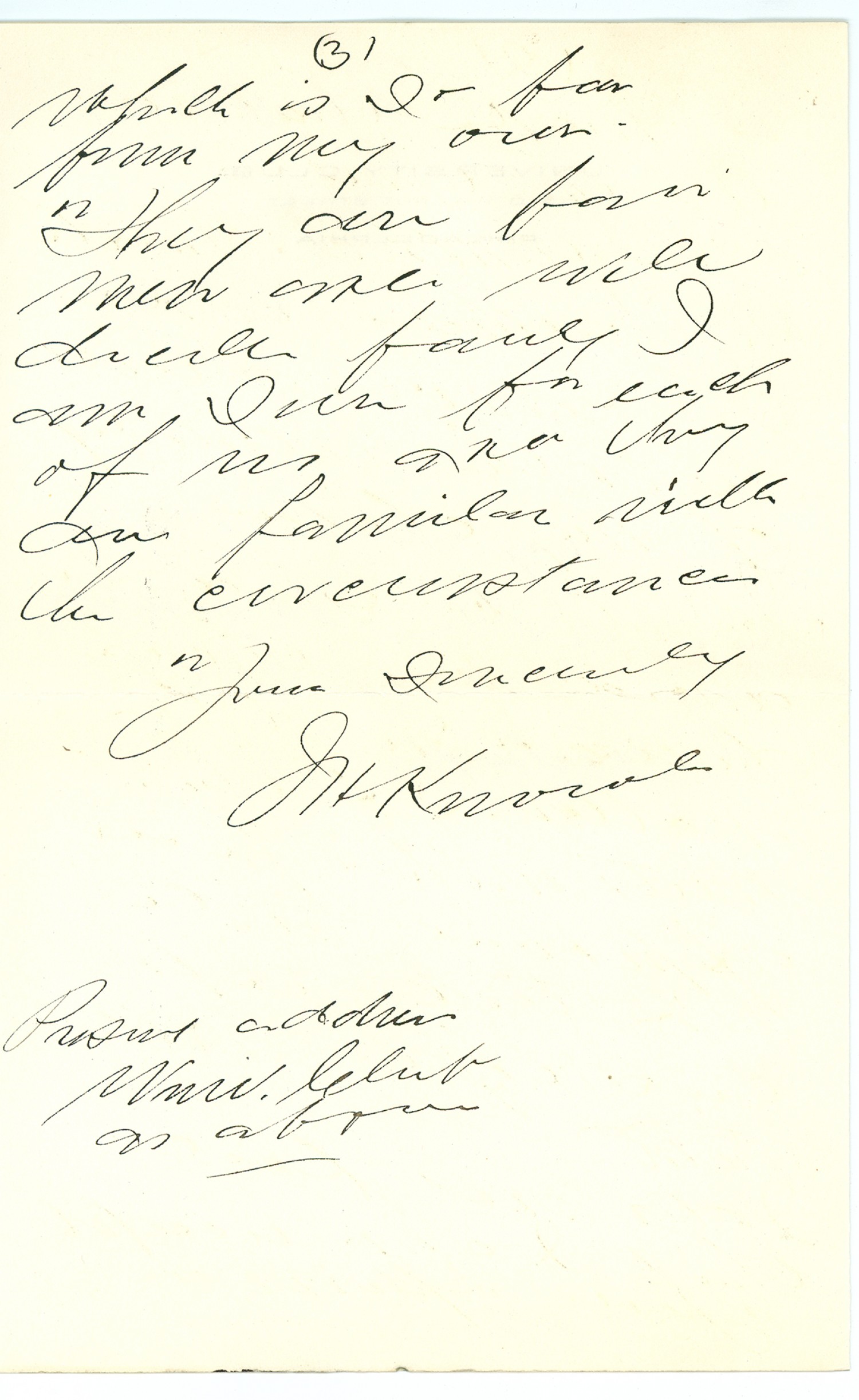 [page 3] [ms illegible: 1 wd] is so far from my own They are fine men [ms illegible: 1 wd] will decide fairly I am [ms illegible: 1 wd] for each of [ms illegible: 1 wd] and they are familiar with the circumstances Yours Sincerely J H Knowles Present address Univ. Club as above
