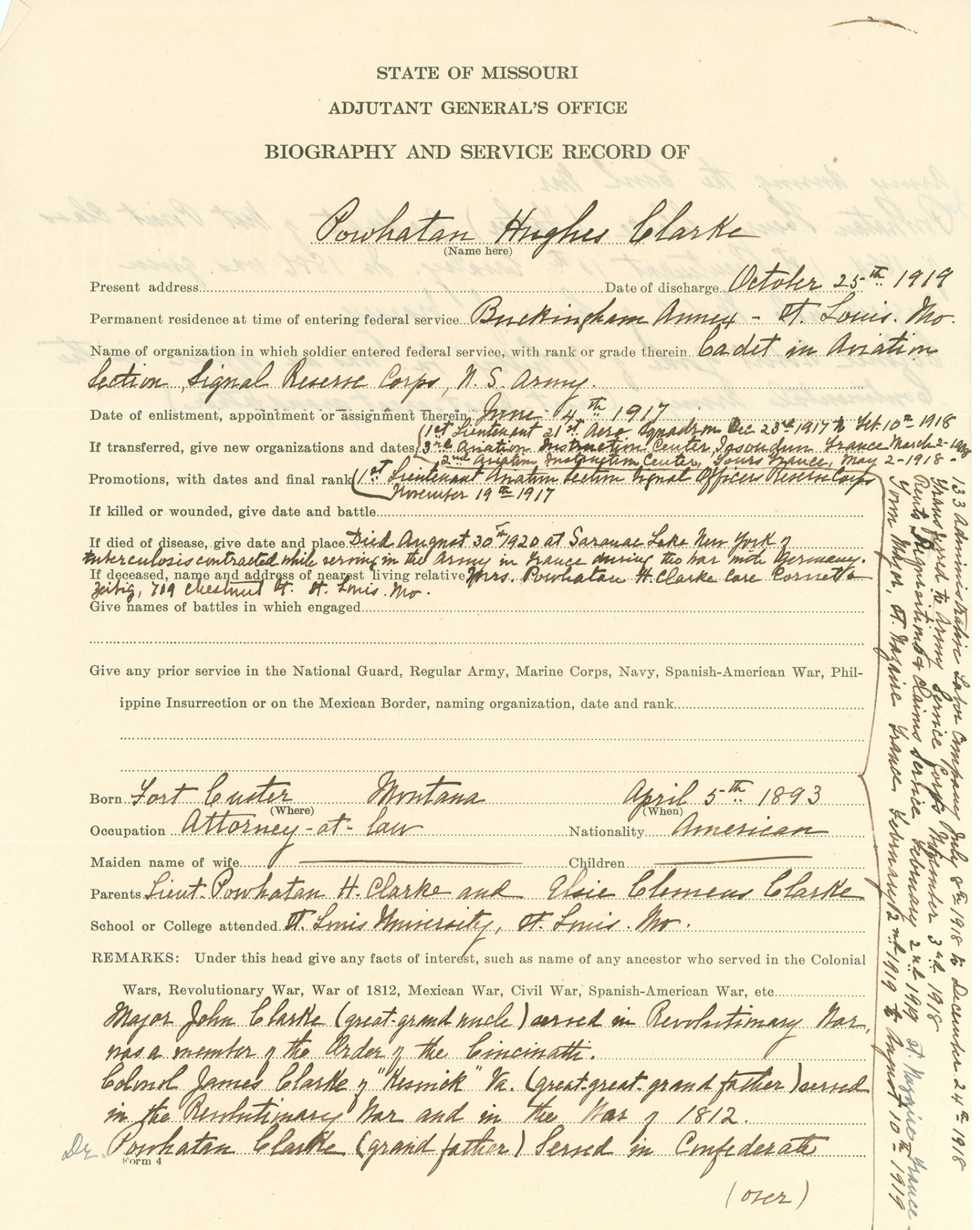 | Description | Powhatan Hughes Clarke served with the 21st Aero Squadron and the Labor Bureau A.E.F. during World War I. He died from tuberculosis August 20, 1920. This was Clarke's Biography and Service Record. These records were sent to veterans of the War so that the state of Missouri could award Missouri veterans a medal. |