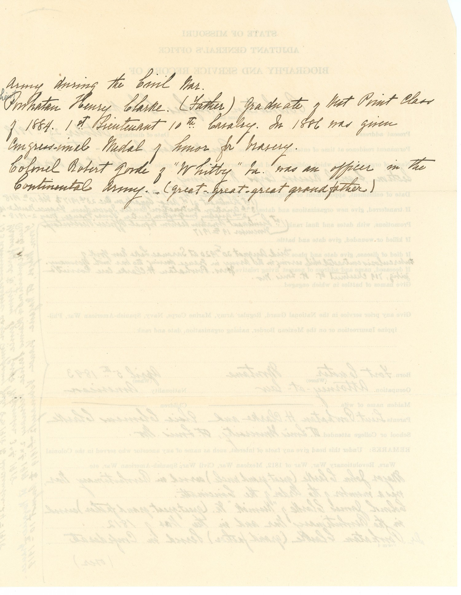 Army during the Civil War. Lieut. Powhatan Henry Clarke. (Father) graduate of West Point Class of 1884. I st Lieutenant 10th Cavalry, in 1886 was given congressional Medal of honor for bravery. Colonel Robert Gorde of