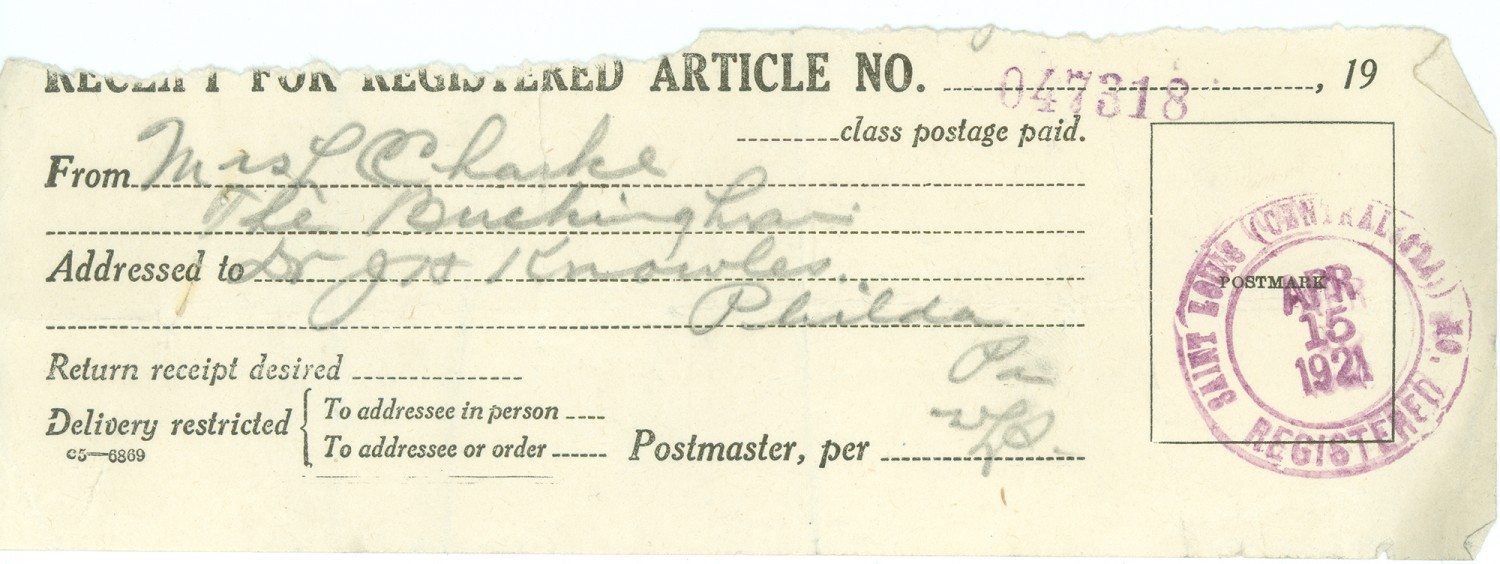 RECEIPT FOR REGISTERED ARTICLE NO. 047318, 19 From Mrs. P Clarke the Buckingham Addressed to Dr JH Knowles [Philadelphia, Pennsylvania] WLS [Stamp] Apr 15 1921