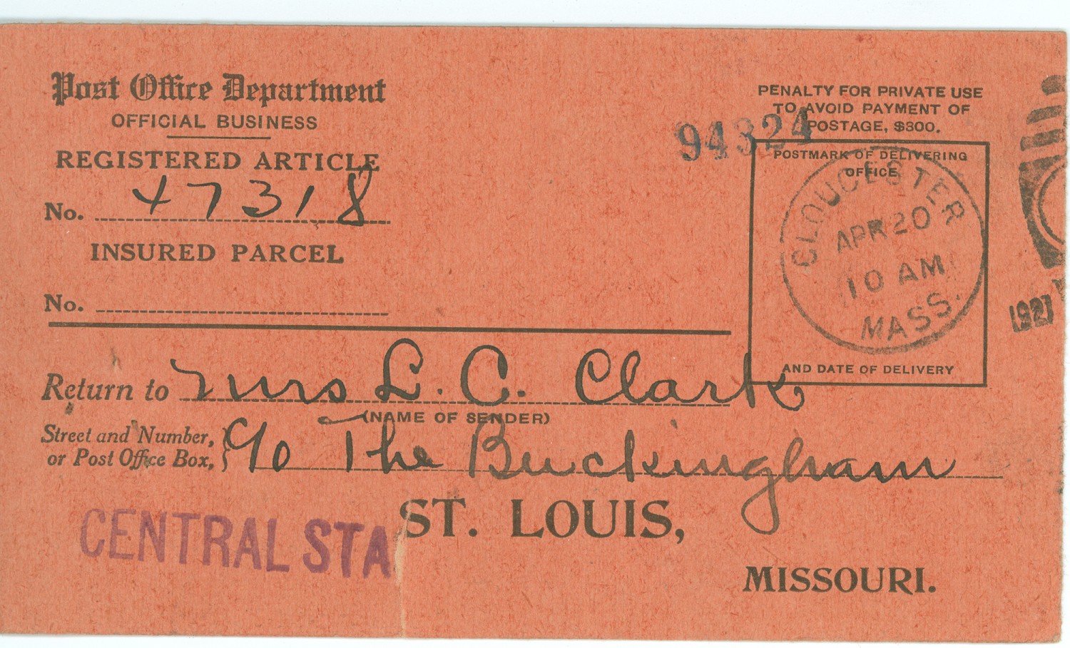 Post Office Department OFFICIAL BUSINESS Registered Article No. 47318 Return to (NAME OF SENDER) Mrs L. C. Clarke Street and Number or Post Office Box] c/o the Buckingham St. Louis, Missouri.