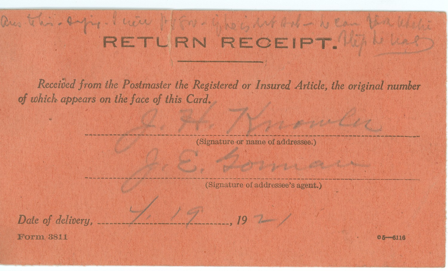 Return Receipt - April 19, 1921
