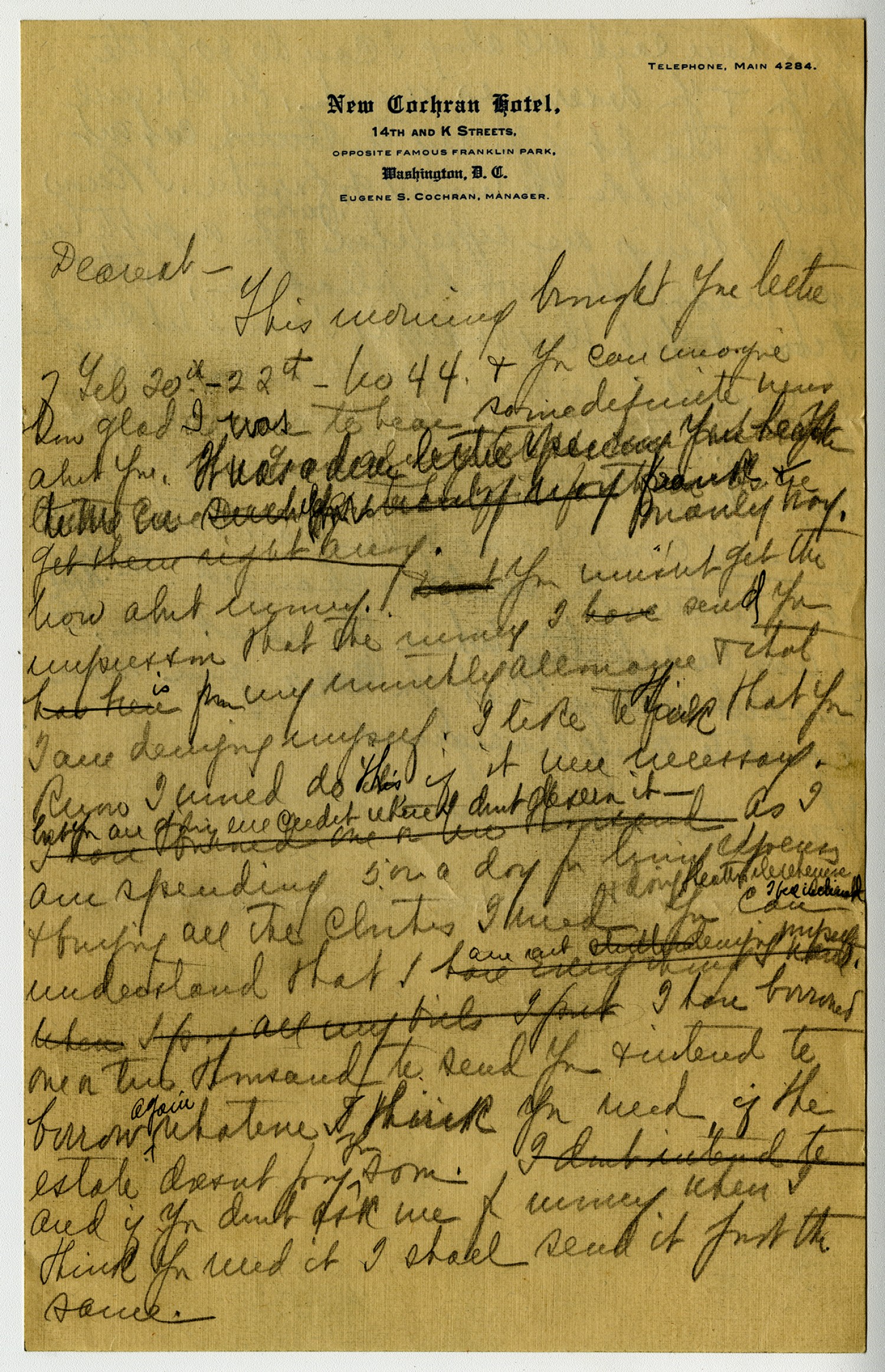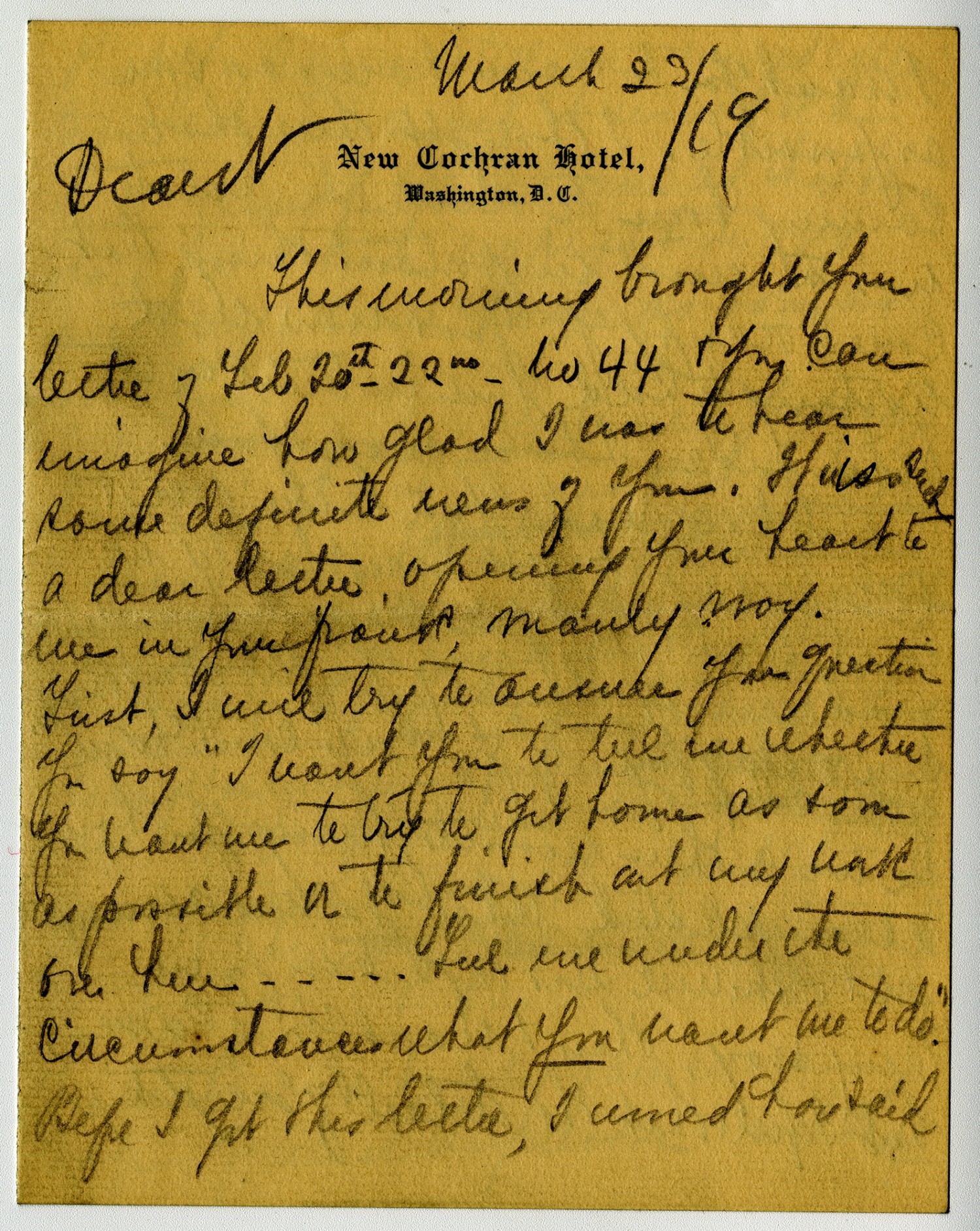 [New Cochran Hotel letterhead] March 23 [1919] Dearst This morning brought your letter of [February] 20th 22nd no 44 & you can imagine how glad I was to hear some definite news of you. It is such a dear letter, opening up your heart to me in your power mainly now. First, I will try to answer your question You say