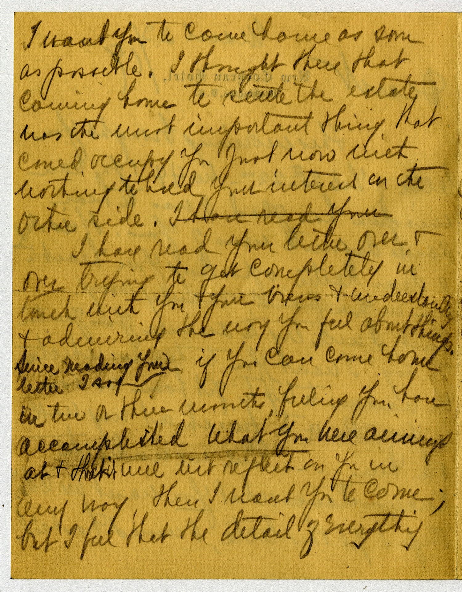 I want you to come home as soon as possible. I thought then that coming home to settle the estate was the most important thing that could occupy You Just now with nothing to hold your interest on the other side. I have read your letter over & over trying to get completely in touch with you & your [ms illegible: 1 wd] & understanding & admiring the way you feel about things. Since reading your letter I suppose if you can come home in two or three months [ms illegible: 1 wd] you have accomplished what you were aiming at & think that it will not reflect on you in any way, then I want you to come, but I feel that the detail of everything