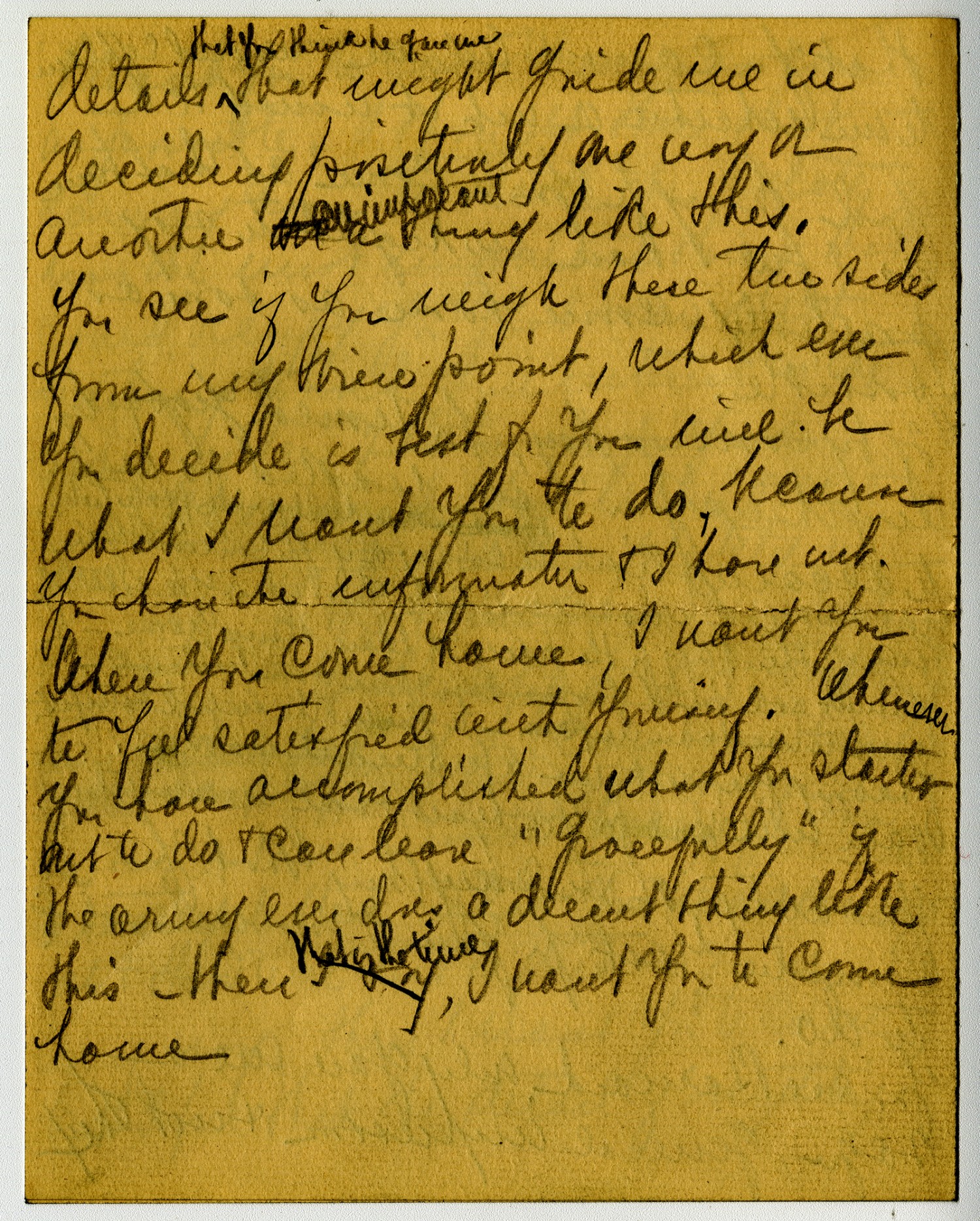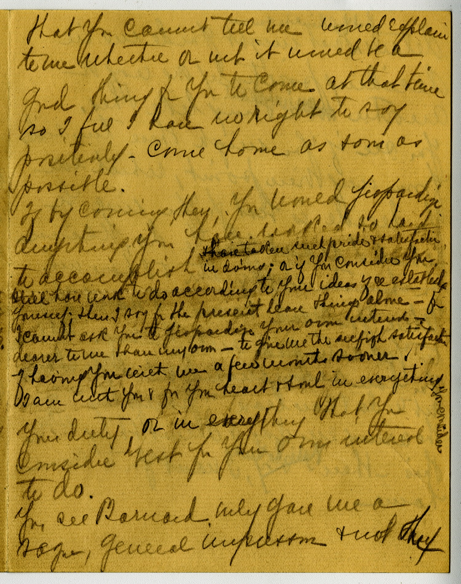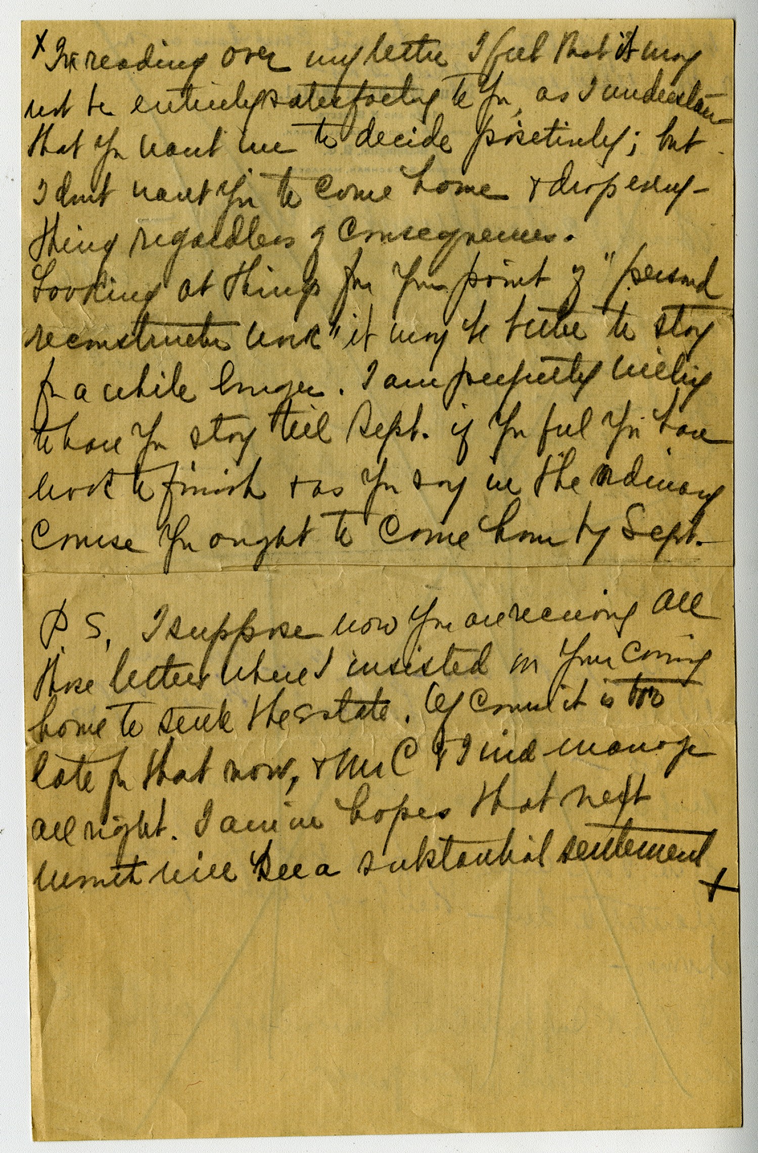 that you cannot tell me would explain to me whether or not it would be a good thing for you to come at that time so I feel I have no right to say positivly. Come home as soon as possible. If by coming then you would Jeopardize anything you have worked so hard to accomplish & have taken such pride & satisfaction in doing; of if you consider [ms illegible: 1 wd] still have work to do according to your ideas [ms illegible: 2 wds] yourself. Then I say for the present leave things alone