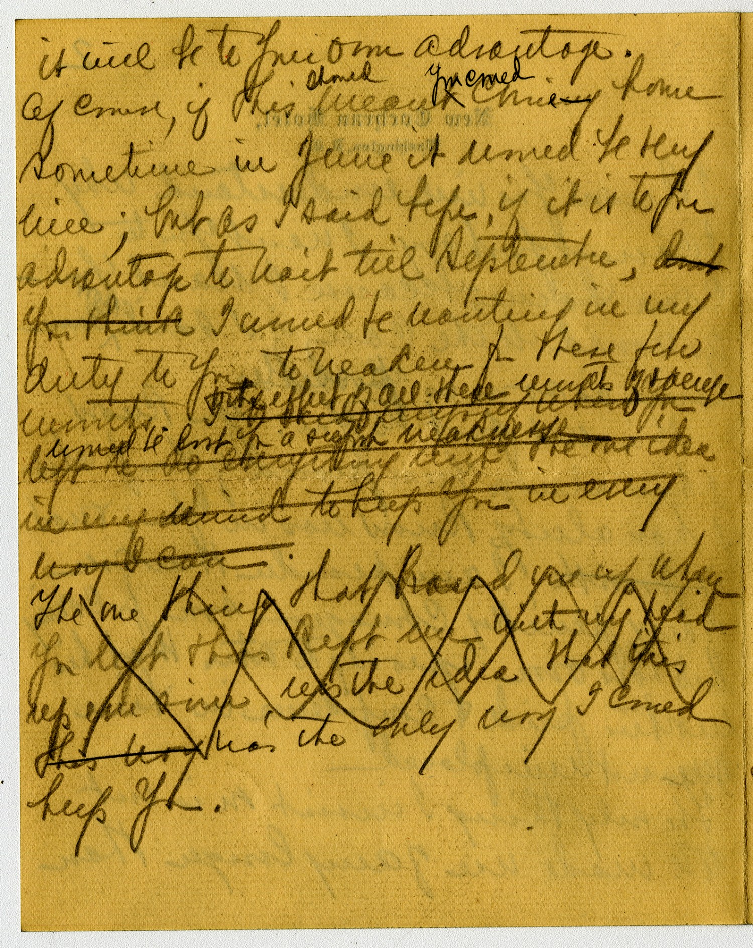 it will be to Your own advantage. Of course, if this should mean you could come home sometime in June it would be very nice; but as I said before, if it is to your advantage to wait til September, I [ms illegible: 1 wd] be wanting in my duty to you to [ms illegible: 1 wd] for these few months. [ms illegible: 2 lines]