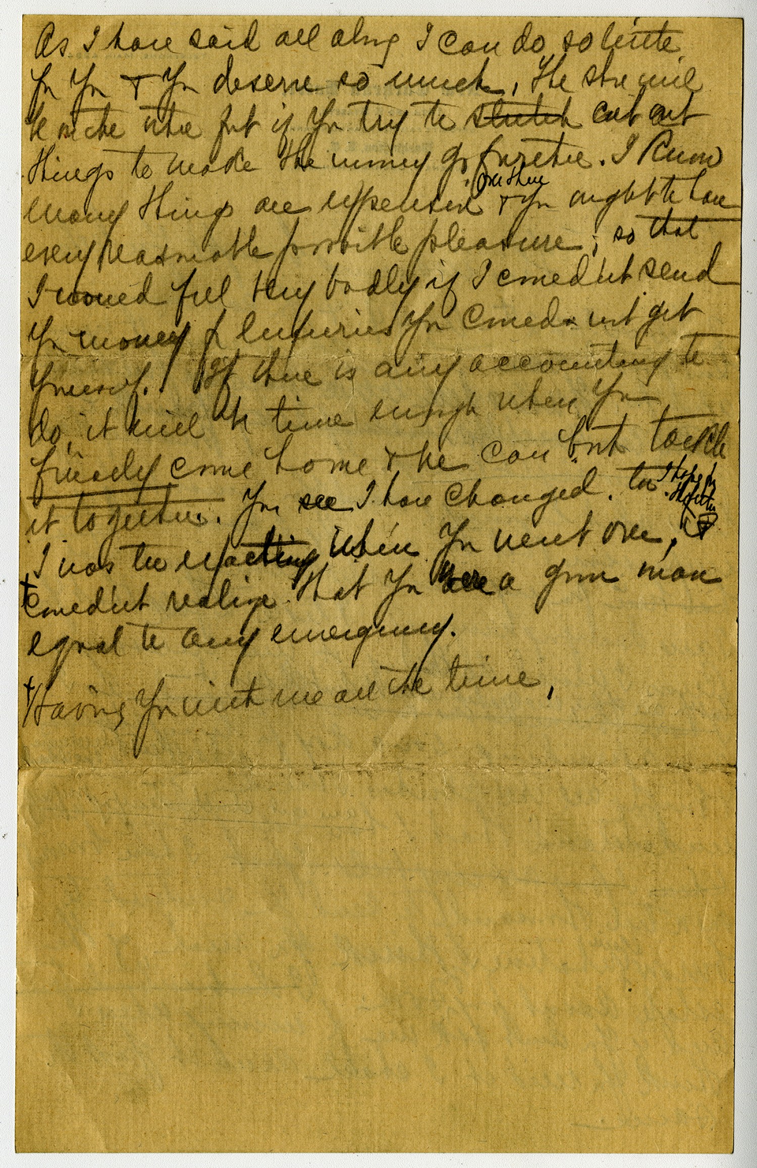As I have said all along I can do so little for you & you deserve so much. The [ms illegible: 5 wds] but if you try to cut out things to make the money go further. I know many things are expensive over there & you aught to have every reasonable possible pleasure; so that I could fell very badly if I couldnt send you money for luxuries you could not get yourself. If there is any accounting to do, it will be time enough where you finally come home & he can but [ms illegible: 1 wd] it together. You see I have changed too I hope for the better I was to exacting when you weren