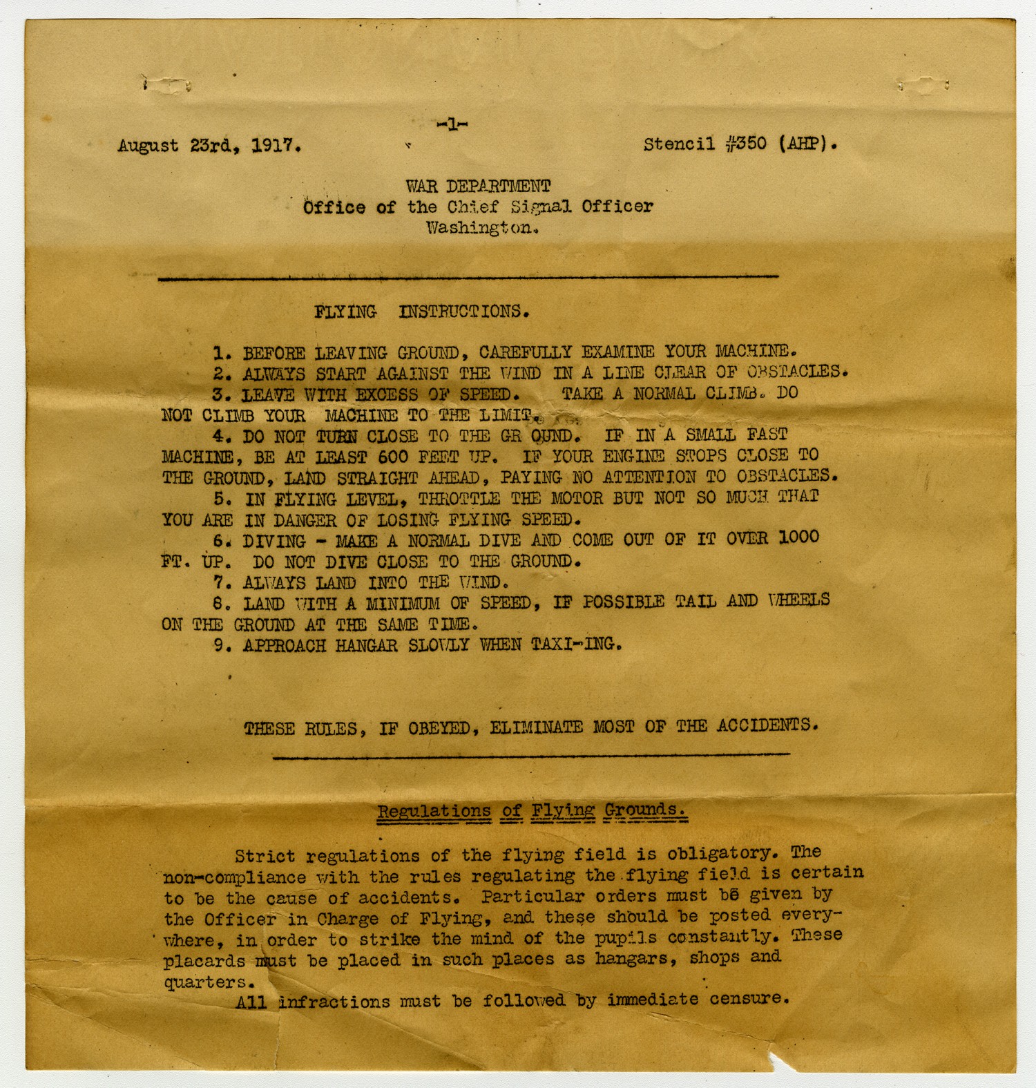 [page 1] August 23rd 1917. Stencil #350 (AHP). WAR DEPARTMENT Office of the Chief Signal Officer Washington. FLYING INSTRUCTIONS. 1. BEFORE LEAVING GROUND, CAREFULLY EXAMINE YOUR MACHINE. 2. ALWAYS START AGAINST THE WIND IN A LINE CLEAR OF OBSTACLES. 3. LEAVE WITH EXCESS SPEED. TAKE A NORMAL CLIMB DO NOT CLIMB YOUR MACHINE TO THE LIMIT. 4. DO NOT TURN CLOSE TO THE GROUND. IF IN A SMALL FAST MACHINE, BE AT LEAST 600 FETT UP. IF YOUR ENGINE STOPS CLOSE THE GROUND, LAND STRAIGHT AHEAD, PAYING NO ATTENTION TO OBSTACLES. 5. IN FLYING LEVEL, THROTTLE THE MOTOR BUT NOT SO MUCH THAT YOU ARE IN DANGER OF LOSING FLYING SPEED. 6. DIVING