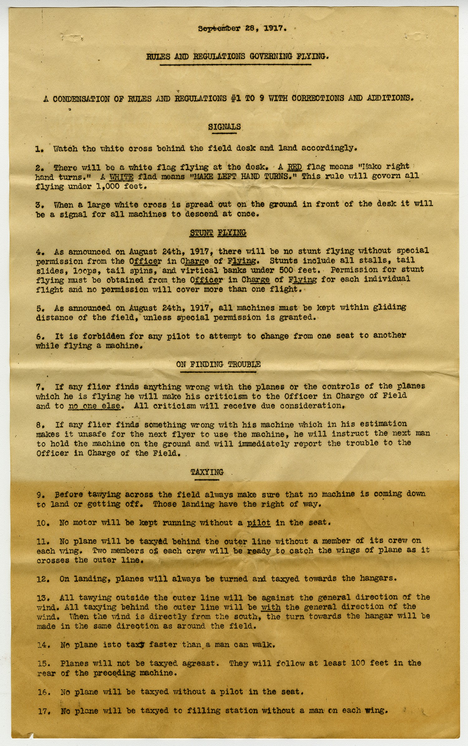 September 28, 1917. RULES AND REGULATIONS GOVERNING FLYING. A CONDENSATION OF RULES AND REGULATIONS #1 TO 9 WITH CORRECTIONS AND ADDITIONS. SIGNALS 1. Watch the white cross behind the field desk and land accordingly. 2. There will be a white flag flying at the desk. A RED flag means