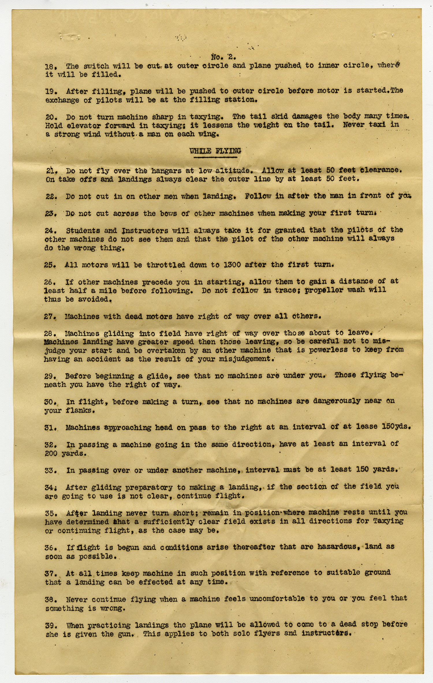 No. 2. 18. The switch will be cut at outer circle and plane pushed to inner circle, where it will be filled. 19. After filling, plane will be pushed to outer circle before motor is started. The exchange of pilots will be at the filling station. 20. Do not turn machine sharp in taxying. The tail skid damages the body many times. Hold elevator forward in taxying: it lessens the weight on the tail. Never taxi in a strong wind without a man on each wing. WHILE FLYING 21. Do not fly over the hangars at low altitude. Allow at least 50 feet clearance. On take offs and landings always clear the outer line by at least 50 feet. 22. Do not cut in on other men when landing. Follow in after the man in front of you. 23. Do not cut across the bows of other machines when making your first turn. 24. Students and Instructors will always take it for granted that the pilots of the other machines do not see them and that the pilot of the other machine will always do the wrong thing. 25. All motors will be throttled down to 1300 after the first turn. 26. If other machines precede you in starting, allow them to gain a distance of at least a half mile before following. Do not follow in trace; propeller wash will thus be avoided. 27. Machines with dead motors have right of way over all others. 28. Machines gliding into field have right of way over those about to leave. Machines landing have greater speed then those leaving, so be careful not to misjudge your start and be overtaken by an other machine that is powerless to keep from having an accident as the result of your misjudgment. 29. Before beginning a glide, see that no machines are under you. Those flying beneath you have the right of way. 30. In flight, before making a turn, see that no machines are dangerously near on your flanks. 31. Machines approaching head on pass to the right at an interval of at least 150yds. 32. In passing a machine going in the same direction, have at least an interval of 200 yards. 33. In passing over or under another machine, interval must be at least 150 yards. 34. After gliding preparatory to making a landing, if the section of the field you are going to use is not clear, continue flight. 35. After landing never turn short; remain in position where machine rests until you have determined that a sufficiently clear field exists in all directions for taxying or continue flight, as the case may be. 36. If flight is begun and conditions arise thereafter that are hazardous, land as soon as possible. 37. At all times keep machine in such position with reference to suitable ground that a landing can be effected at any time. 38. Never continue flying when a machine feels uncomfortable to you or you feel that something is wrong. 39. When practicing landings the plane will be allowed to come to a dead stop before she is given the gun. This applies to both solo flyers and instructors.