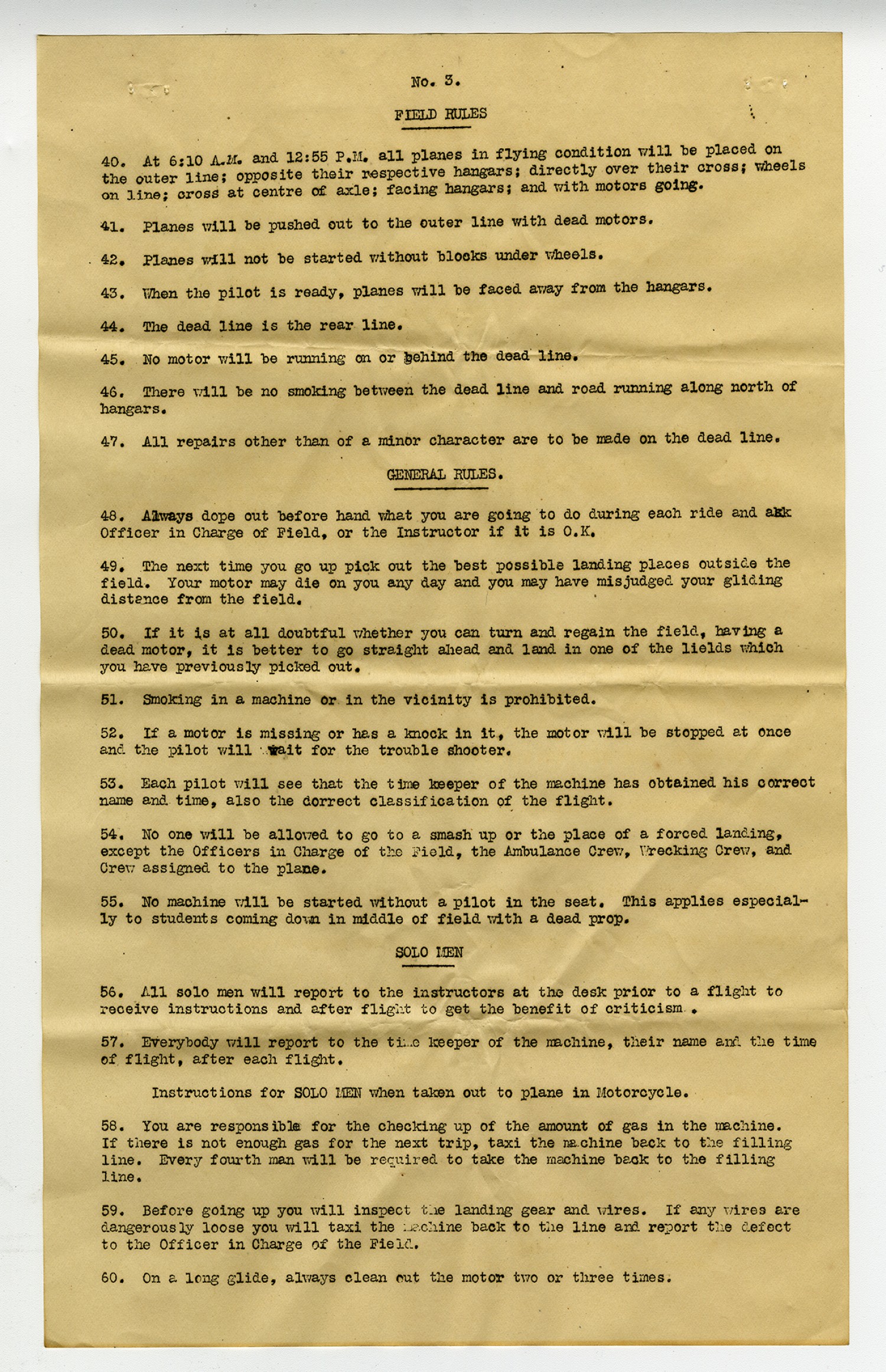 No. 3 Field Rules 40. At 6:10 A.M. and 12:55 P.M. all planes in flying condition will be placed on the outer line; opposite their respective hangars; directly over their cross; wheels on line; cross at centre of axle; facing hangars; and with motors going. 41. Planes will be pushed out to the outer line with dead motors. 42. Planes will not be started without blocks under wheels. 43. When the pilot is ready, planes will be faced away from the hangars. 44. The dead line is the rear line. 45. No motor will be running on or behind the dead line. 46. There will be no smoking between the dead line and road running along north of hangars. 47. All repairs other than of a minor character are to be made on the dead line. GENERAL RULES. 48. Always dope out before hand what you are going to do during each ride and ask Officer in Charge of Field, or the instructor if it is O.K. 49. The next time you go up pick out the best possible landing places outside the field. Your motor may die on you any day and you may have misjudged your gliding distance from the field. 50. If it is all doubtful that whether you can turn and regain the field, having a dead motor, it is better to go straight ahead and land in one of the lields which you have previously picked out. 51. Smoking in a machine or in the vicinity is prohibited. 52. If a motor is missing or has a knock in it, the motor will be stopped at once and the pilot will wait for the trouble shooter. 53. Each pilot will see that the time keeper of the machine has obtained his correct name and time, also the correct classification of the flight. 54. No one will be allowed to go to a smash up or the plane of a forced landing, except the Officers in Charge of the Filed, the Ambulance Crew, Wrecking Crew, and Crew assigned to the plane. 55. No machine will be started without a pilot in the seat. This applies especially to students coming down in middle of field with a dead prop. SOLO MEN 56. All solo men will report to the instructors at the desk prior to a flight to receive instructions and after flight to get the benefit of criticism. 57. Everybody will report to the time keeper of the machine, their name and the time of flight, after each flight. Instructions for SOLO MEN when taken out to a plane in Motorcycle. 58. You are responsible for the checking up of the amount of gas in the machine. If there is not enough gas for the next trip, taxi the machine back to the filling line. Every fourth man will be required to take the machine back to the filling line. 59. Before going up you will inspect the landing gear and wires. If any wires are dangerously loose you will taxi the machine back to the line and report the defect to the Officer in Charge of the Field. 60. On a long glide, always clean out the motor two or three times.
