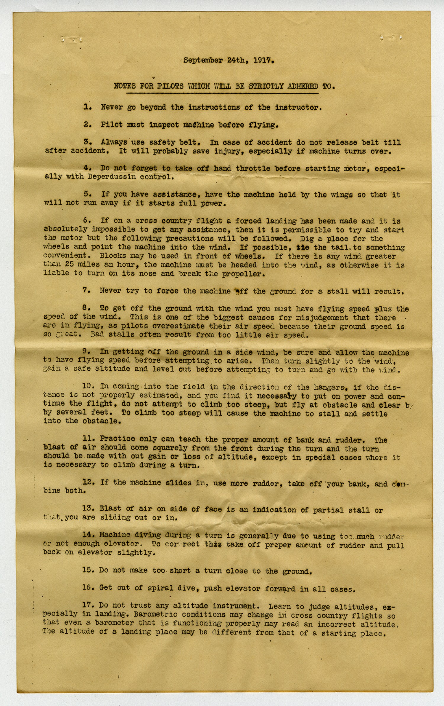 September 24th, 1917. NOTES FOR PILOTS WHICH WILL BE STRICTLY ADHEARED TO. 1. Never go beyond the instructions of the instructor. 2. Pilot must inspect machine before flying. 3. Always use safety belt. In case of accident do not release belt till after accident. It will probably save injury, especially if machine turns over. 4. Do not forget to take off hand throttle before starting motor, especially with Deperdussin control. 5. If you have assistance, have the machine held by the wings so that it will not run away if it starts full power. 6. If on a cross country flight a forced landing has been made and it is absolutely impossible to get any assistance, then it is permissible to try and start the motor but the following precautions will be followed. Dig a place for the wheels and point the machine into the wind. If possible, tie the tail to something convenient. Blocks may be used in front of wheels. If there is any wind greater than 25 miles an hour, the machine must be headed into the wind, as otherwise it is liable to turn on its nose and break the propeller. 7. Never try to force the machine off the ground for a stall will result. 8. To get off the ground with the wind you must have flying speed plus the speed of the wind. This is one of the biggest causes for misjudgment that there are in flying, as pilots overestimate their air speed because their ground speed is so great. Bad stalls often result from too little air speed. 9. In getting off the ground in a side wind, be sure and allow the machine to have flying speed before attempting to arise. Then turn slightly to the wind, gain a safe altitude and level out before attempting to turn and go with the wind. 10. In coming into the field in the direction of the hangars, if the distance is not properly estimated, and you find it necessary to put on power and continue the flight, do not attempt to climb too steep, but fly at obstacle and clear by several feet. To climb too steep will cause the machine to stall and settle into the obstacle. 11. Practice only can teach the proper amount of bank and rudder. The blast of air should come squarely from the front during the turn and the turn should be made with out gain or loss of altitude, except in special cases where it is necessary to climb during a turn. 12. If the machine slides in, use more rudder, take off your bank, and combine both. 13. Blast of air on side of face is an indication of partial stall or that you are sliding out or in. 14. Machine driving during a turn is generally due to using too much rudder or not enough elevator. To correct this take off proper amount of rudder and pull back on elevator slightly. 15. Do not make too short a turn close to the ground. 16. Get out of spiral dive, push elevator forward in all cases. 17. Do not thrust any altitude instrument. Learn to judge altitudes, especially in landing. Barometric conditions may change in cross country flights so that even a barometer that is functioning properly may read an incorrect altitude. The altitude of a landing place may be different from that of a starting place.