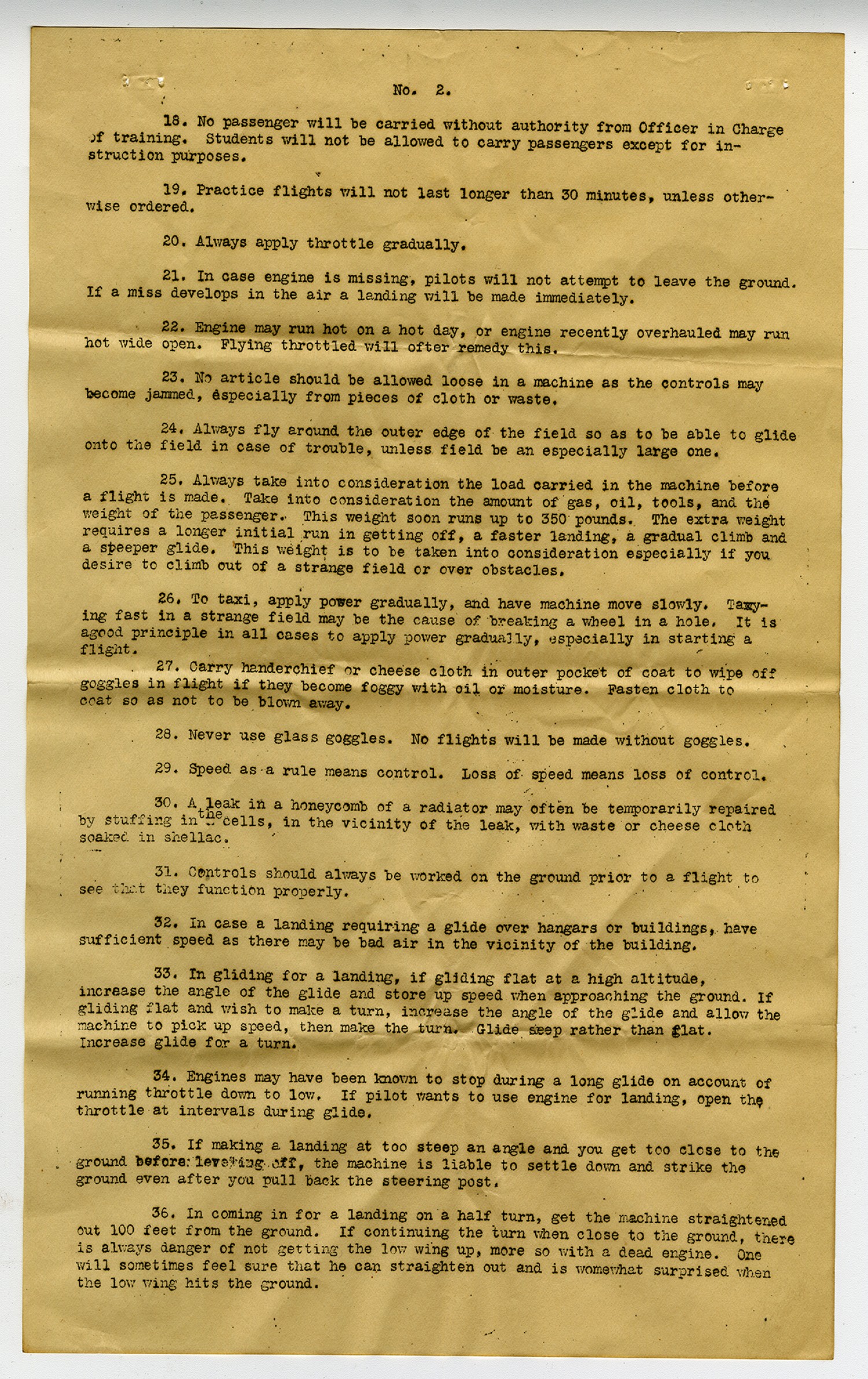 [No. 2] 18. No passenger will be carried without authority from Officer in Charge of Training. Students will not be allowed to carry passengers except for instruction purposes. 19. Practice flights will not last longer than 30 minutes, unless otherwise ordered. 20. Always apply throttle gradually. 21. In case engine is missing, pilots will not attempt to leave the ground. If a miss develops in the air a landing will be made immediately. 22. Engine may not run hot on a hot day, or engine recently overhauled may run hot wide open. Flying throttled will often remedy this. 23. No article should be allowed loose in a machine as the controls may become jammed, especially from a piece of cloth or waste. 24. Always fly around the outer edge of the field so as to be able to glide onto the field in case of trouble, unless field be an especially large one. 25. Always take into consideration the load carried in the machine before a flight is made. Take into consideration the amount of gas, oil, tools, and the weight of the passenger. This weight soon runs up to 350 pounds. The extra weight requires a longer initial run in getting off, a faster landing, a gradual climb and a steeper glide. This weight is to be taken into consideration especially if you desire to climb out of a strange field or over obstacles. 26. To taxi, apply power gradually, and have machine move slowly. Taxying fast in a strange field may be the cause of breaking a wheel in a hole. It is agood principle in all cases to apply power gradually, especially in starting a flight. 27. Carry handkerchief or cheese cloth in outer pocket of coat to wipe off goggles in flight if they become foggy with oil or moisture. Fasten cloth to coat so as not to be blown away. 28. Never use glass goggles. No flights will be made without goggles. 29. Speed as a rule means control. Loss of speed means loss of control. 30. A leak in a honeycomb of a radiator may often be temporarily repaired by stuffing in the cells, in the vicinity of the leak, with waste or cheese cloth soaked in shellac. 31. Controls should always be worked on the ground prior to a flight to see that they function properly. 32. In case a landing requiring a glide over hangars or buildings, have sufficient speed as there may be bad air in the vicinity of the building. 33. In gliding for a landing, if gliding flat at high altitude, increase the angle of the glide and store up speed when approaching the ground. If gliding flat and wish to make a turn, increase the angle of the glide and allow the machine to pick up speed, then make the turn. Glide seep rather than flat. Increase glide for a turn. 34. Engines may have been known to stop during a long glide on account of running throttle down to low. If pilot wants to use engine for landing, open the throttle at intervals during glide. 35. If making a landing at too steep an angle and you get too close to the ground before leveling off, the machine is liable to settle down and strike the ground even after you pull back the steering post. 36. In coming in for a landing on a half turn, get the machine straightened out 100 feet from the ground. If continuing the turn when close to the ground, there is always danger of not getting the low wing up, more so with a dead engine. One will sometimes feel sure he can straighten out and is womewhat surprised when the low wing hits the ground.