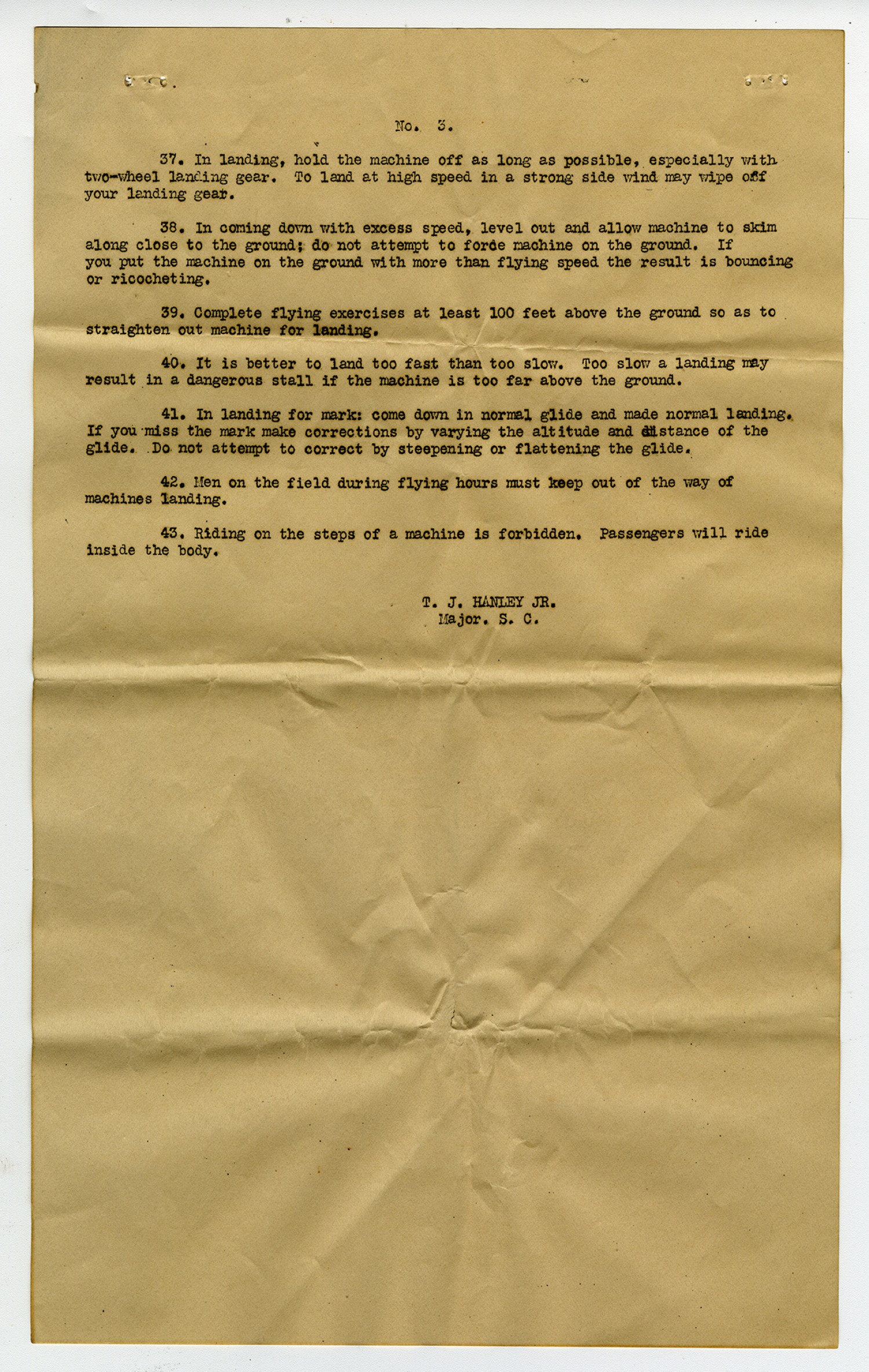 [No. 3.] 37. In landing, hold the machine off as long as possible, especially with two-wheel landing gear. To land at high speed in a strong side wind may wipe off your landing gear. 38. In coming down with excess speed, level out and allow machine to skim along close to the ground; do not attempt to force the machine on the ground. If you put the machine on the ground with more than flying speed the result is bouncing or ricocheting. 39. Complete flying exercises at least 100 feet above the ground so as to straighten out machine for landing. 40. It is better to land too fast than too slow. Too slow a landing may result in a dangerous stall if the machine is too far above the ground. 41. In landing for mark: come down in normal glide and made normal landing. If you miss the mark make corrections by varying the altitude and distance of the glide. Do not attempt to correct by steepening of flattening the glide. 42. Men on the filed during flying hours must keep out of the way of machines landing. 43. Riding on the steps of a machine is forbidden. Passengers will ride inside the body. T.J. Hanley JR. Major. S.C.