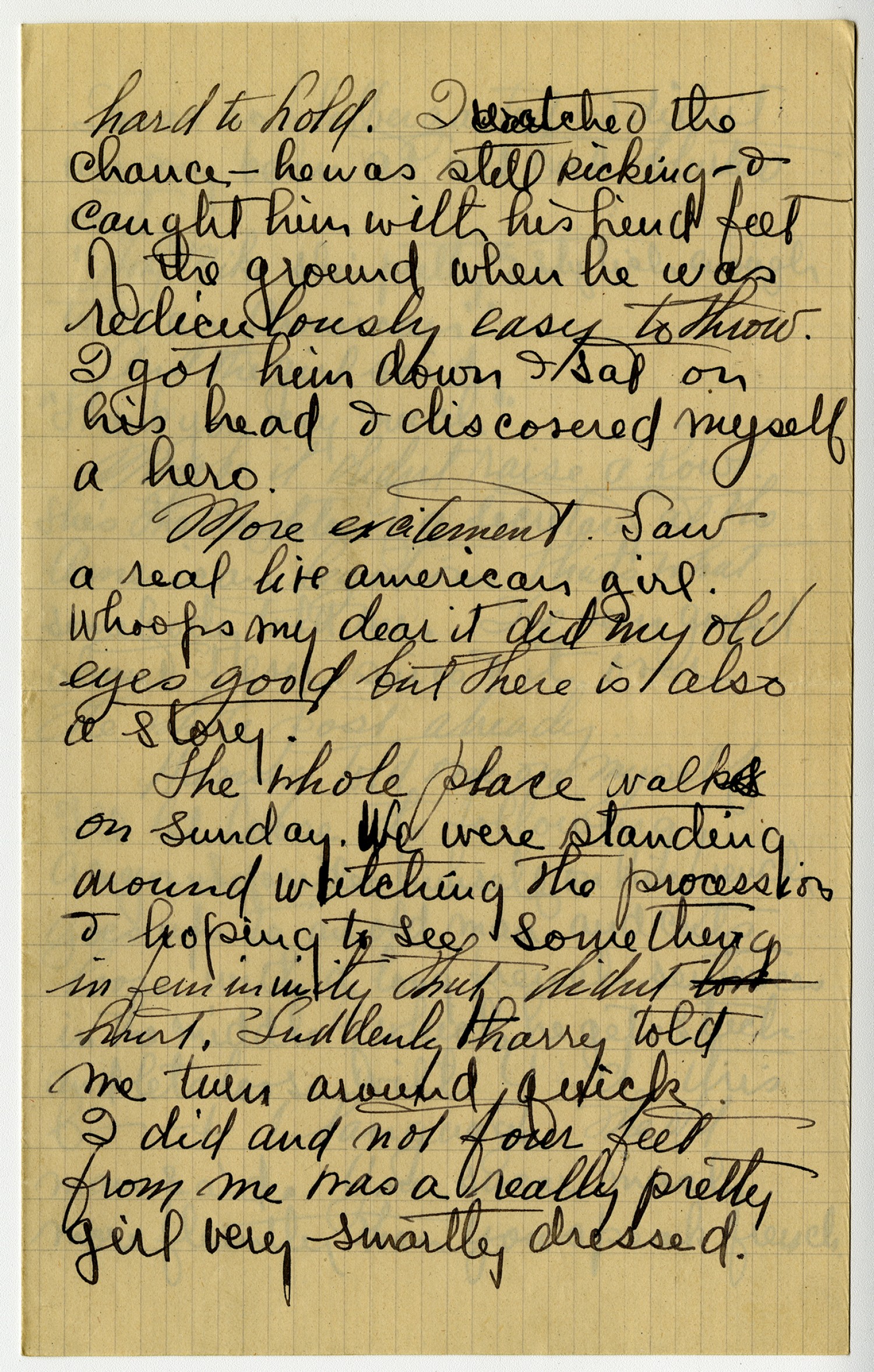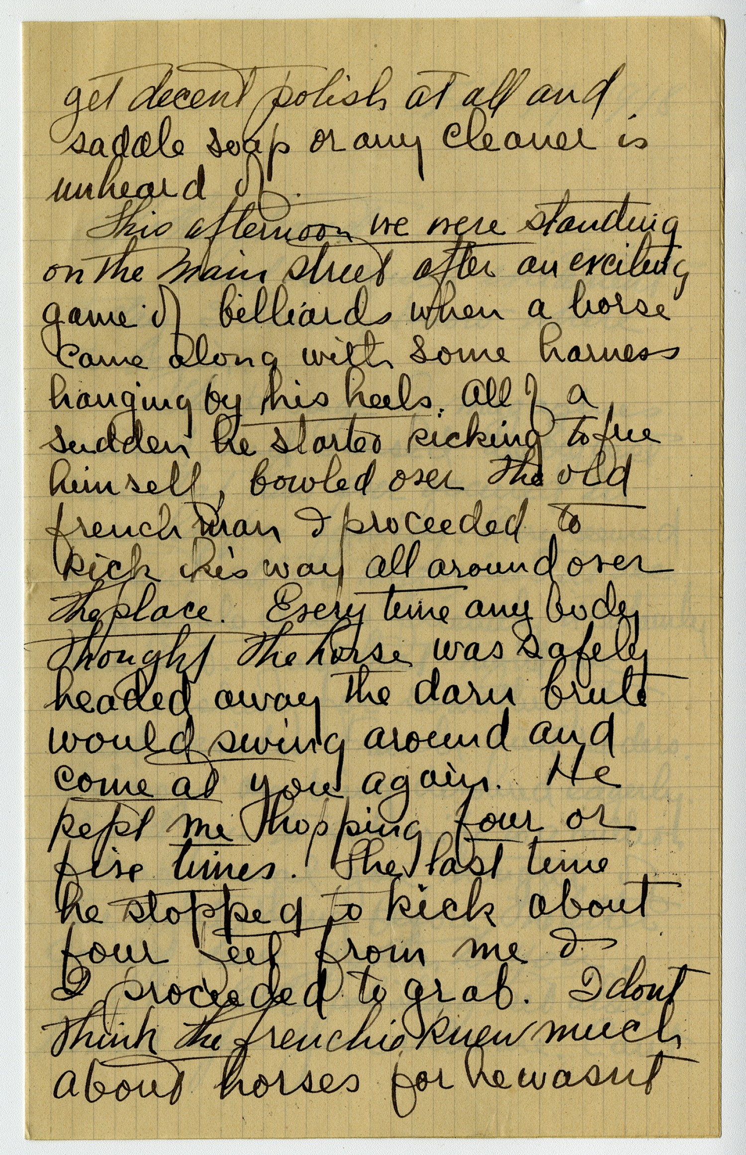 get decent polish at all and saddle soap or any cleaner is unheard of. This afternoon we were standing on the main street after an exciting game of billiards when a horse came along with some harness hanging by his heels. All of a sudden he started kicking to free himself bowled over the old French man & proceeded to kick his was all around over the place. Every time any body thought the horse was safely headed away the darn brute would swing around and come at you again. He kept me hopping four or five times. The last time he stopped to kick about four feet from me & I proceeded to grab. I don