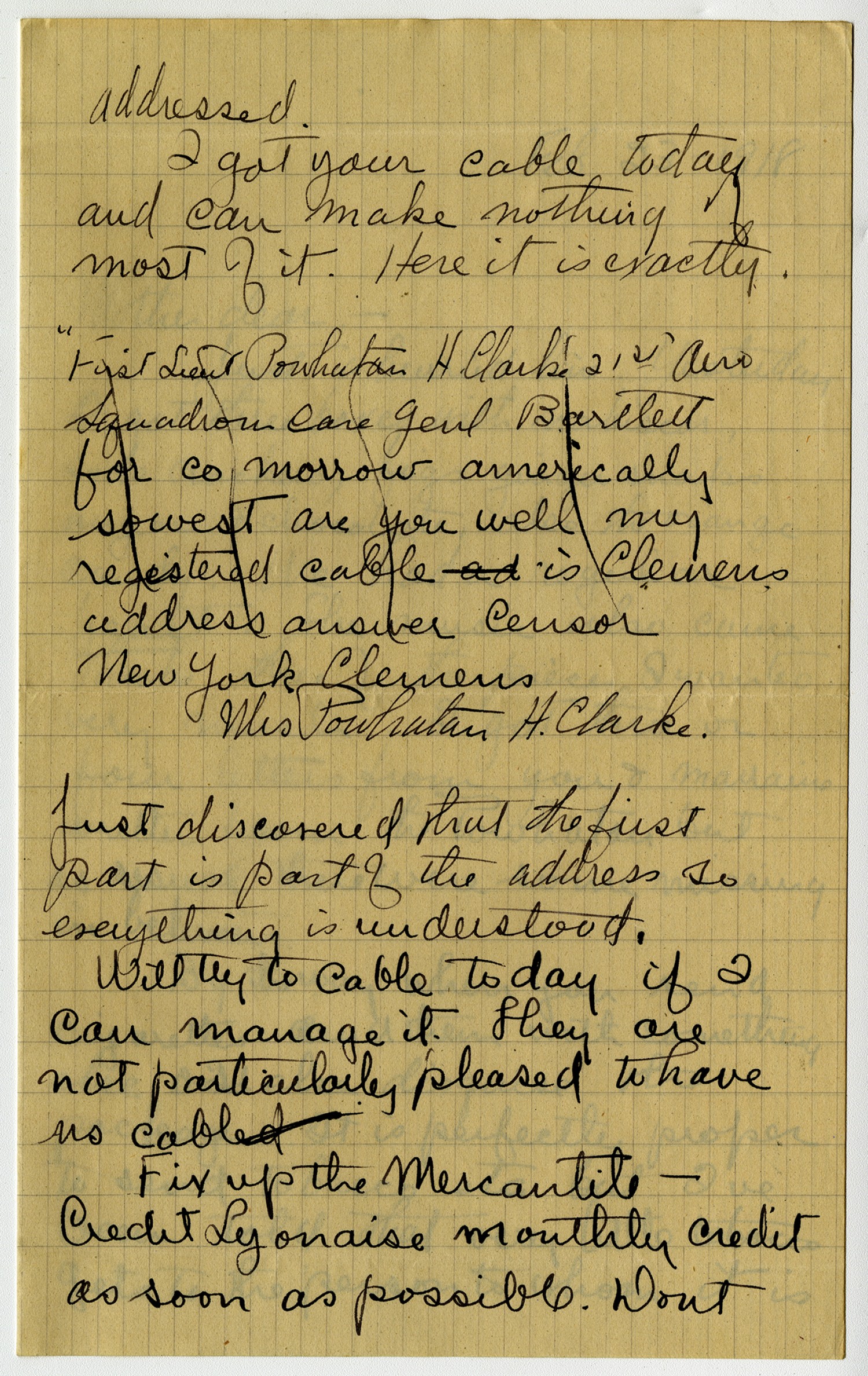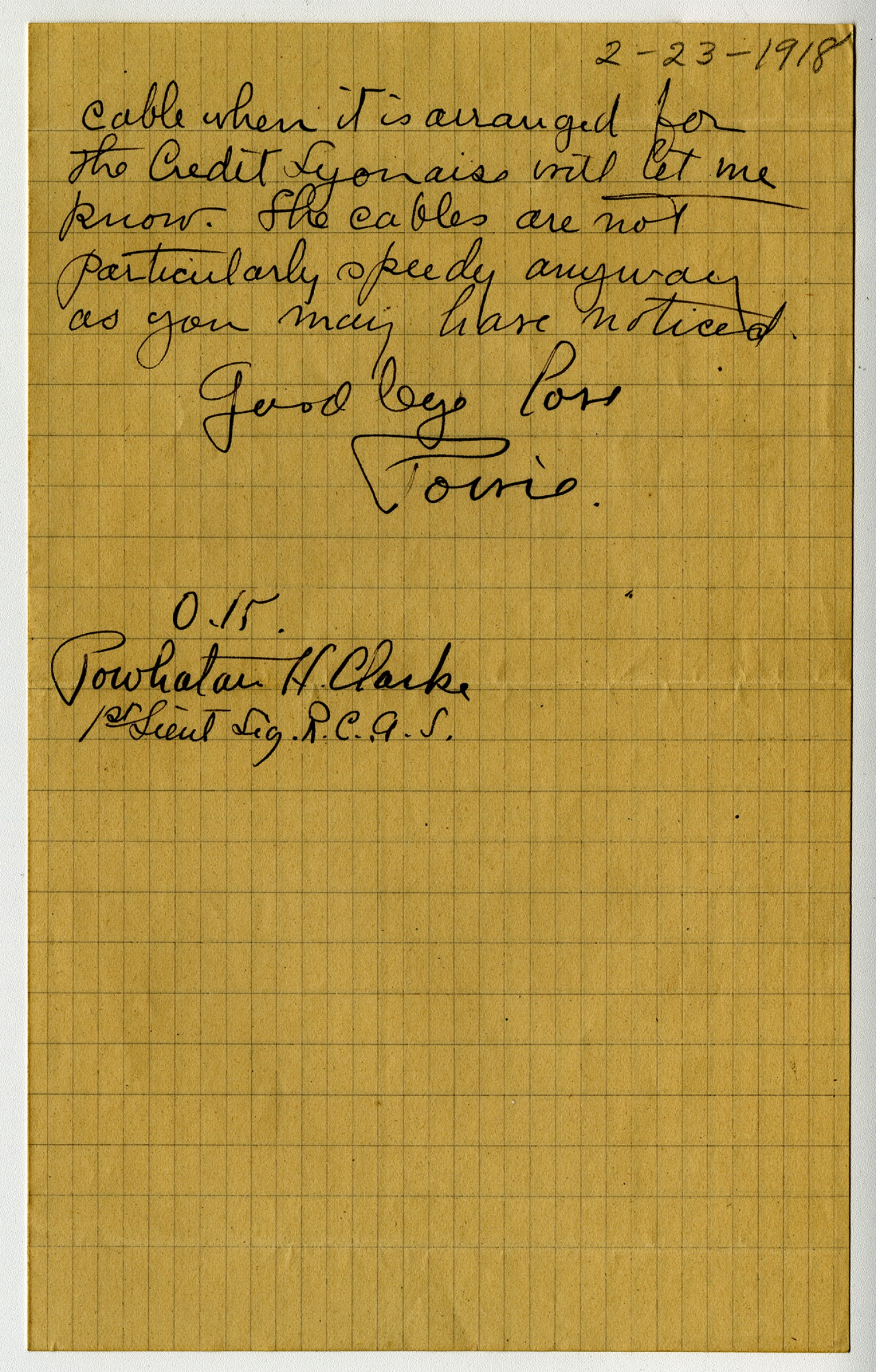 2-23-1918 cable when it is arranged for the Credit Lyonnaise will let me know. The cables are not particularly speedy anyway as you may have noticed. Good Bye Poss Powie O.K. Powhatan H. Clarke 1st Lieut. Sig.R.C.A.S.