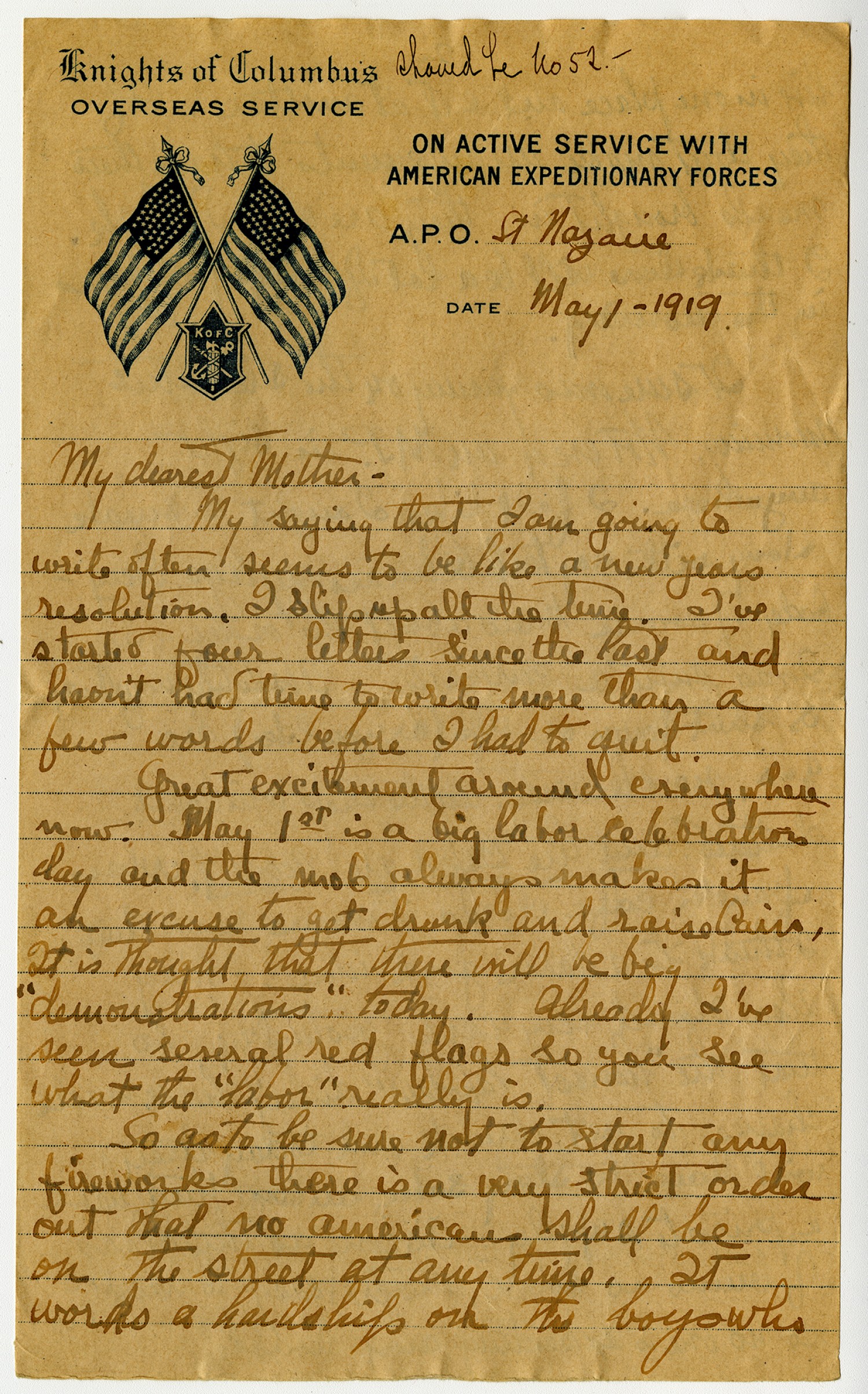 [Knights of Columbus letterhead] should be No. 52 A.P.O. St. Nazaire date May 1