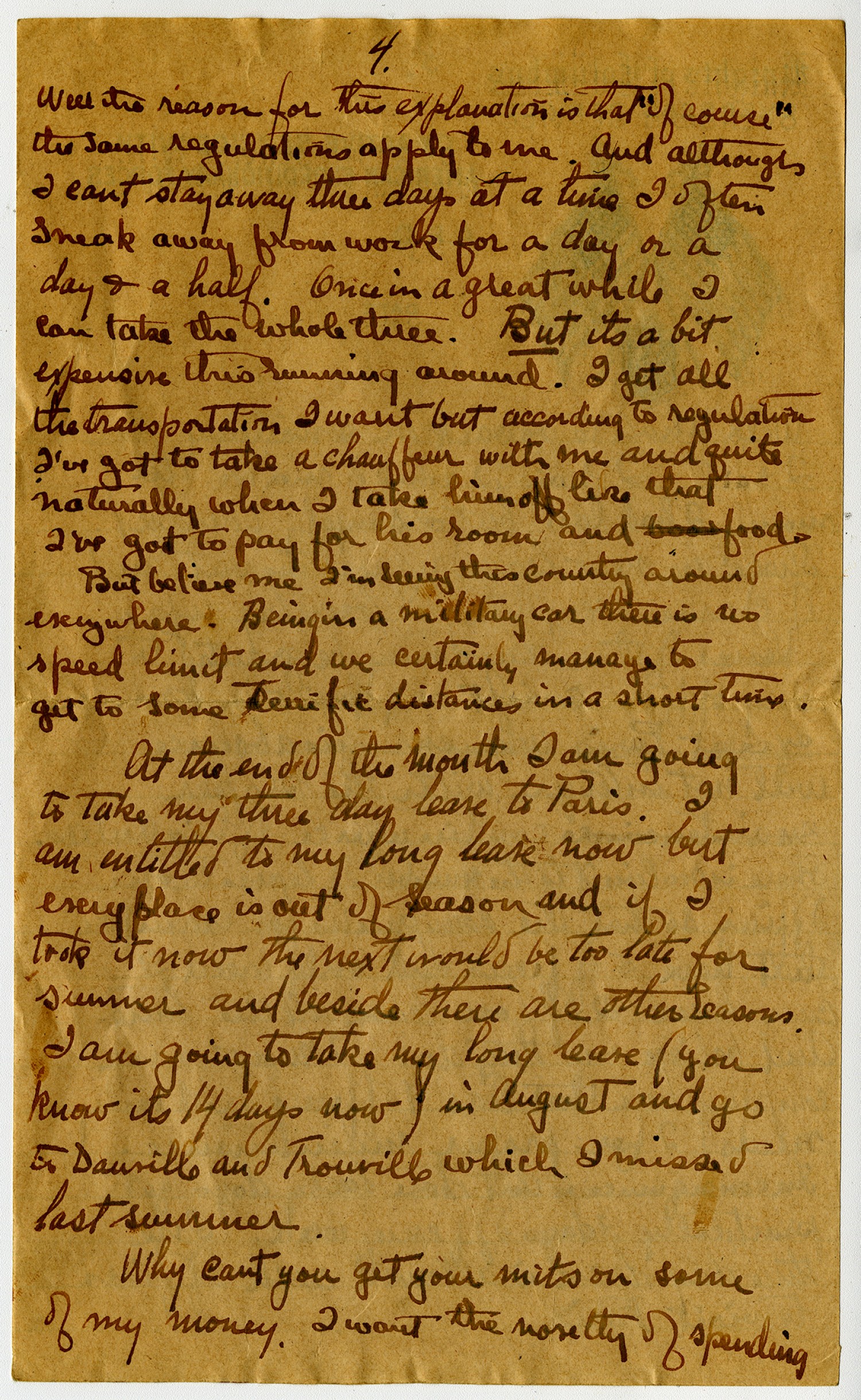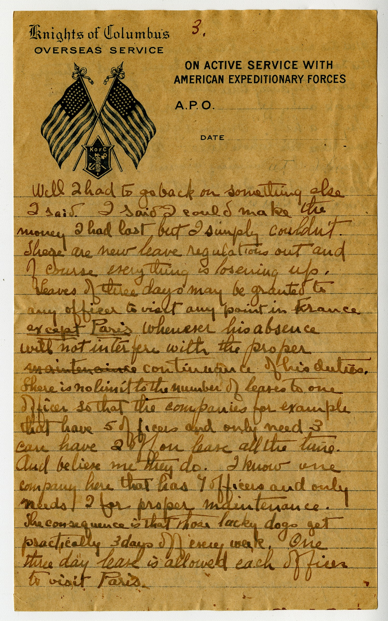 | Description | Powhatan H. Clarke wrote to his mother Elizabeth about a new regulation that allowed him to take as many three day leaves as he desired. Clarke served with the 21st Aero Squadron and Labor Bureau A.E.F. during Word War I. |