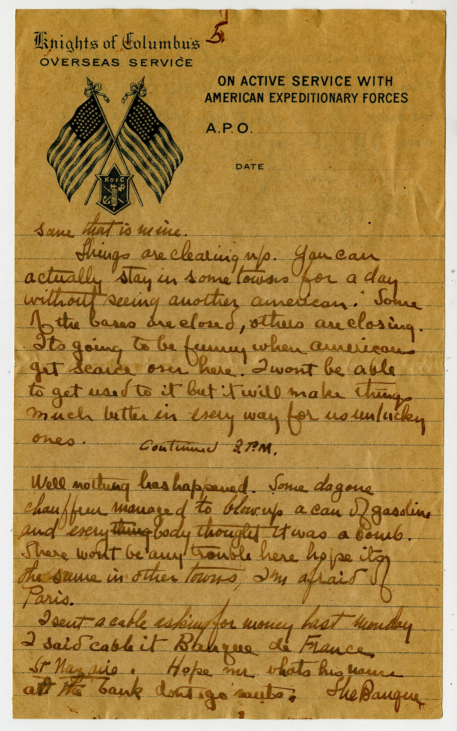 [page 5] [Knights of Columbus letterhead] some that is mine. Things are clearing up. You can actually stay in some towns for a day without seeing another American. Some of the bases are closed, others are closing. Its going to be funny when Americans get scarce over here. I wont be able to get used to it but it will make things much better in every way for us unlucky ones. Continued 3.P.M. Well nothing has happened. Some dagone chauffer managed to blowup a can of gasoline and everybody thought it was a bomb. There wont be any trouble here hope it
