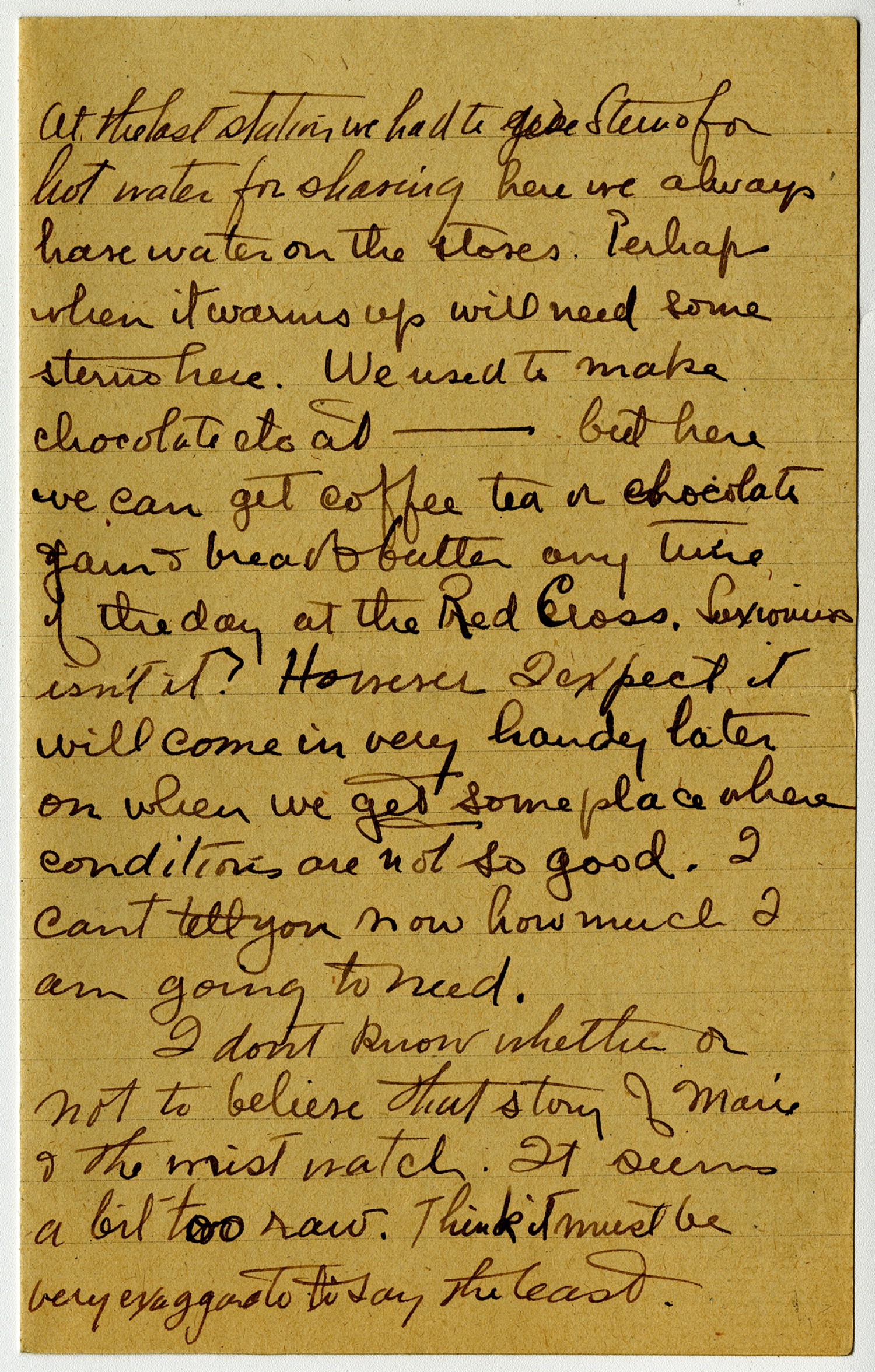 At the last station we had to [ms illegible: 1 wd] sterno for hot water for shaving here we always have water on the stoves. Perhaps when it warms up will need some sterno here. We used to make chocolate etc. at