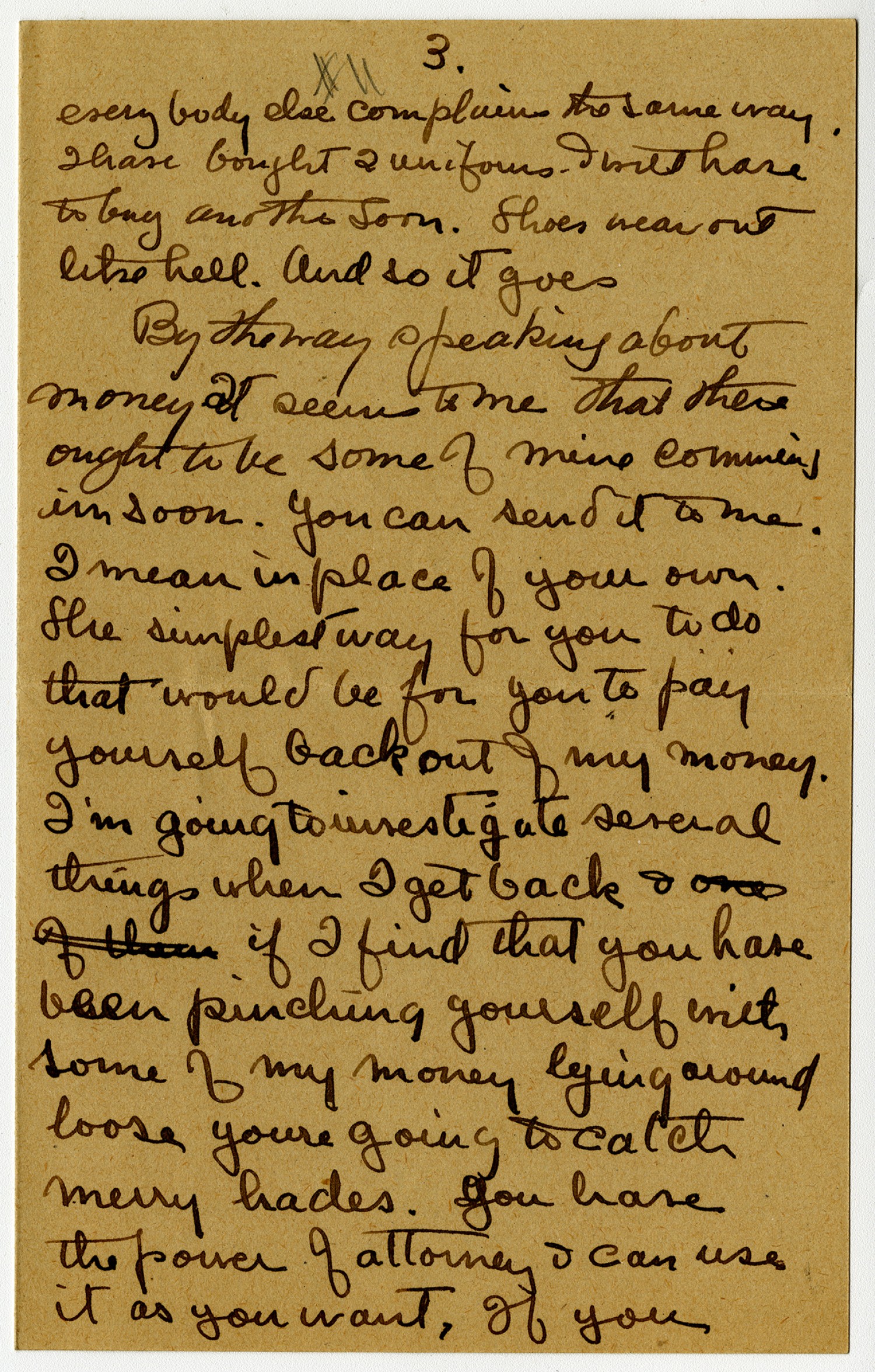 [page 3] #11 everybody else complains the same way. I have bought 2 uniforms. I would have to buy another soon. Shoes wear out like hell. And so it goes. By the way speaking about money it seems to me that there ought to be some of mine coming in soon. You can send it to me. I mean in place of your own. The simplest way for you to do that would be for you to pay yourself back out of my money. I