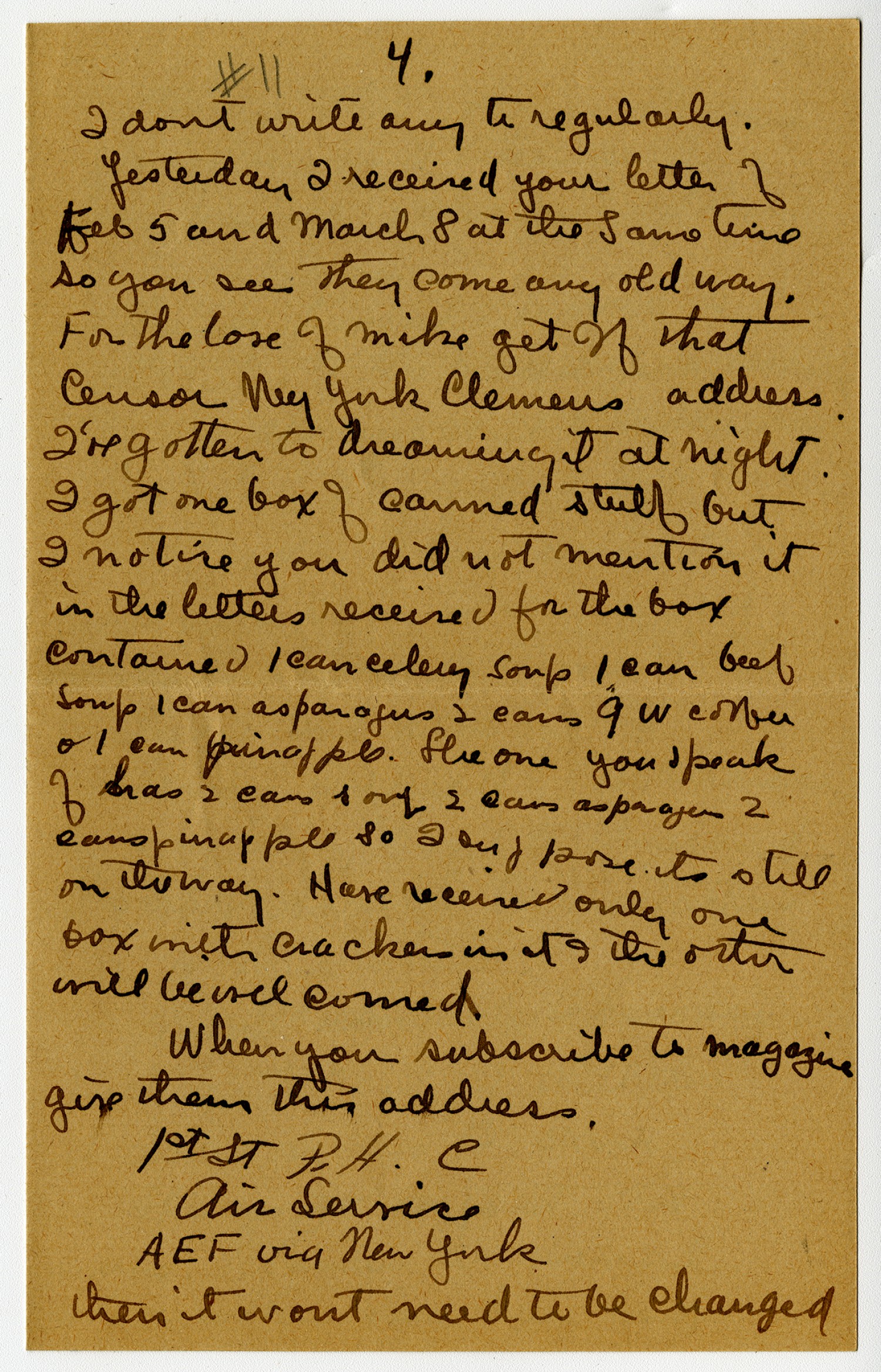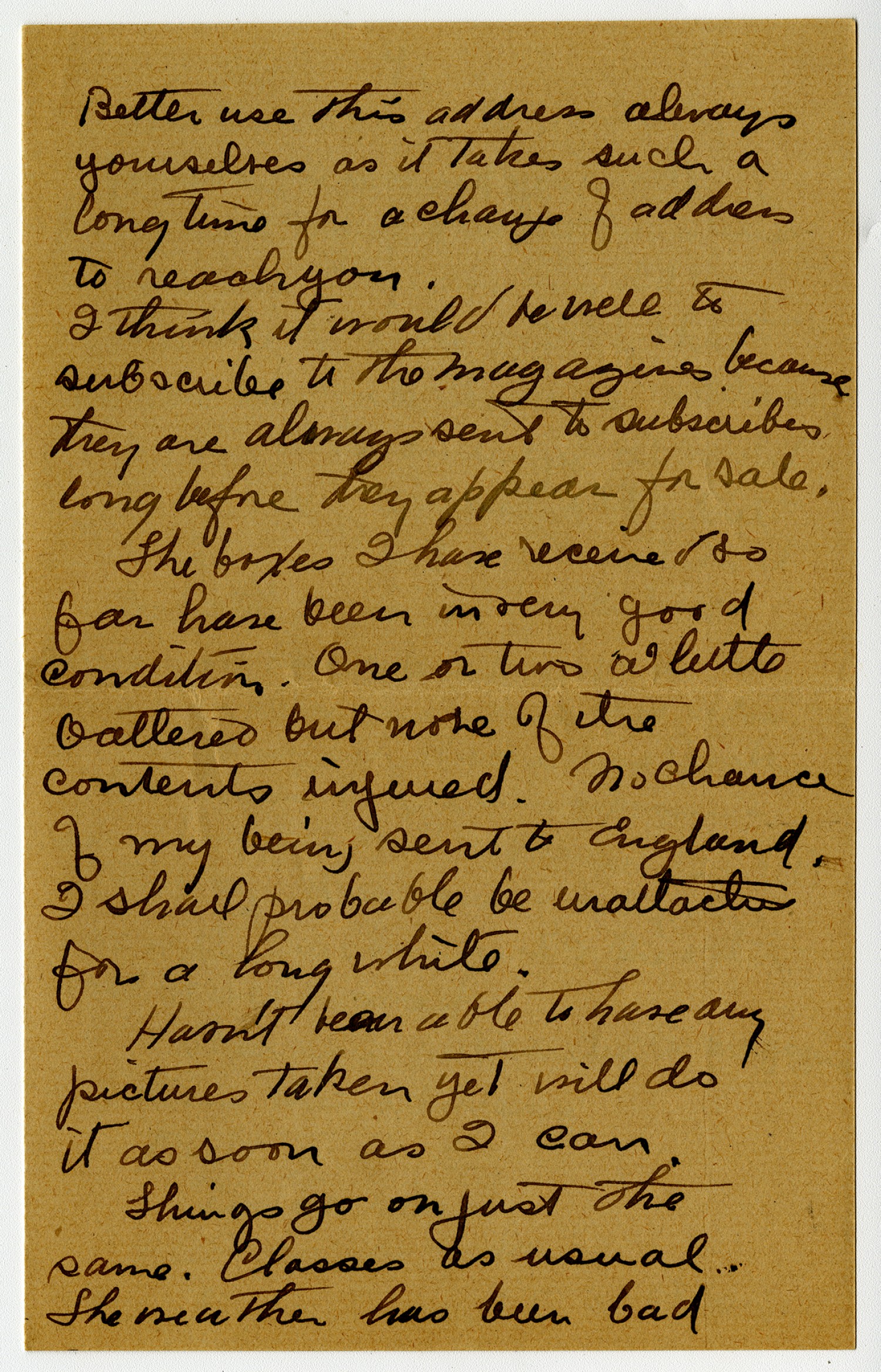 Better use this address always yourselves as it takes such a long time for a change of address to reach you. I think it would be well to subscribe to the magazines because they are always sent to subscribers long before they appear for sale. The boxes I have received so far have been in very good condition. One or two a little battered but more of the contents injured. No chance of my being sent to England. I shall probable be unattached for a long while. Havn