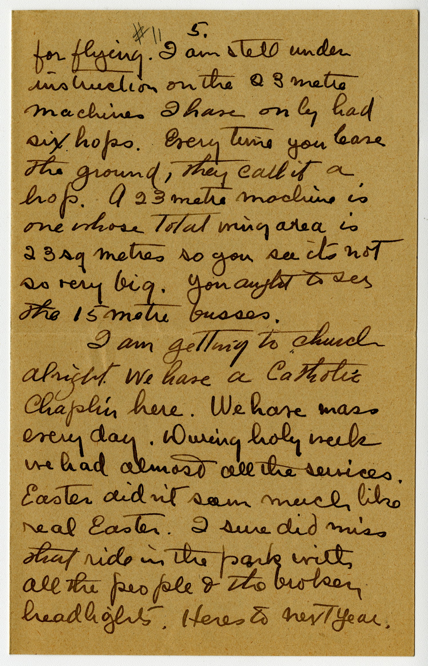 [page 5] #11 for flying. I am still under instruction on the 23 metre machines. I have only had six hops. Every time you leave the ground they call it a hop. A 23 metre machine is one whose total wing area is 23 sq meters so you can see it