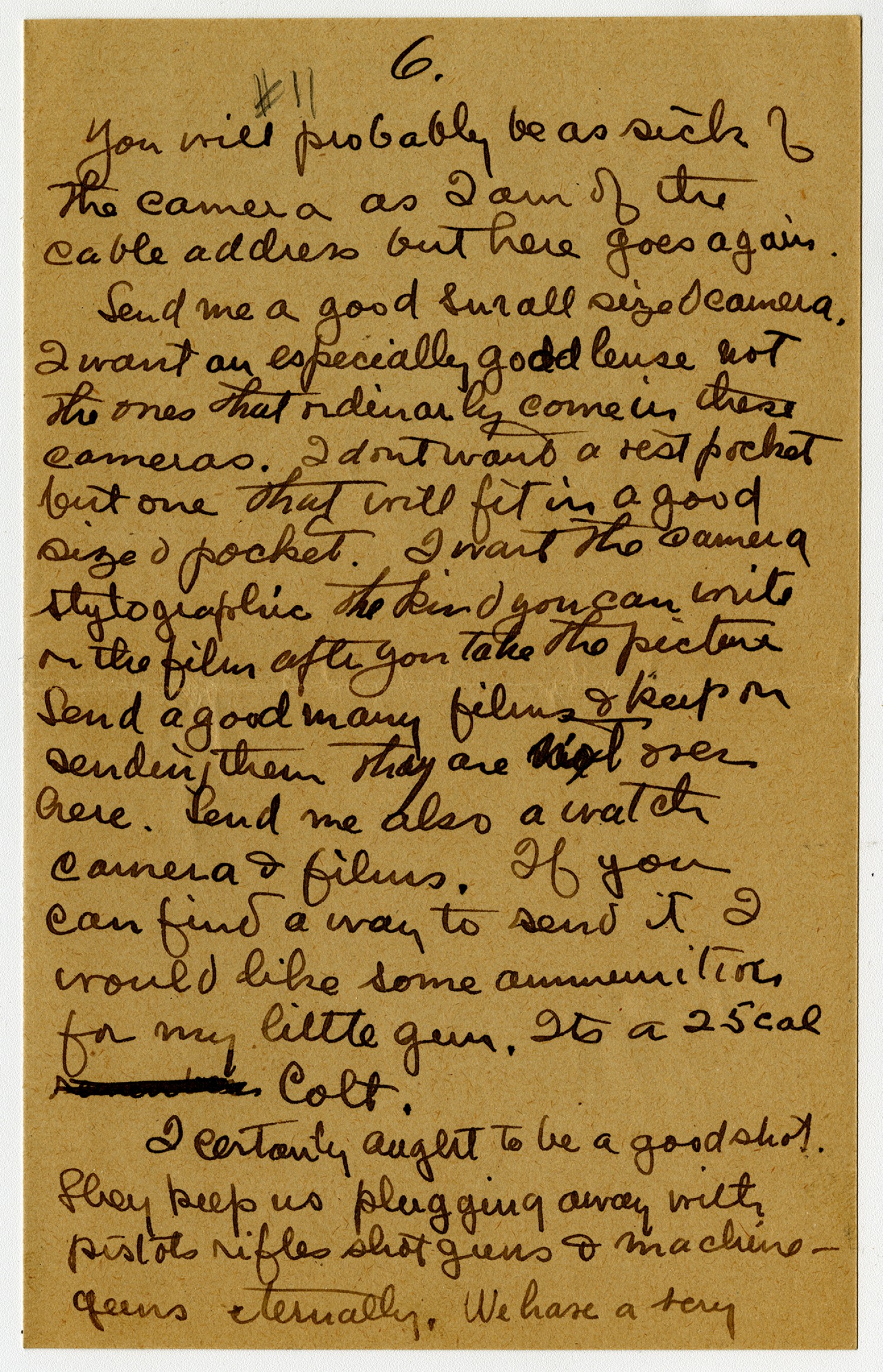 [page 6] #11 You will probably be as sick of the camera as I am of the cable address but here goes again. Send me a good Small sized camera. I want an especially good lense not the ones that ordinarly come in these cameras. I don