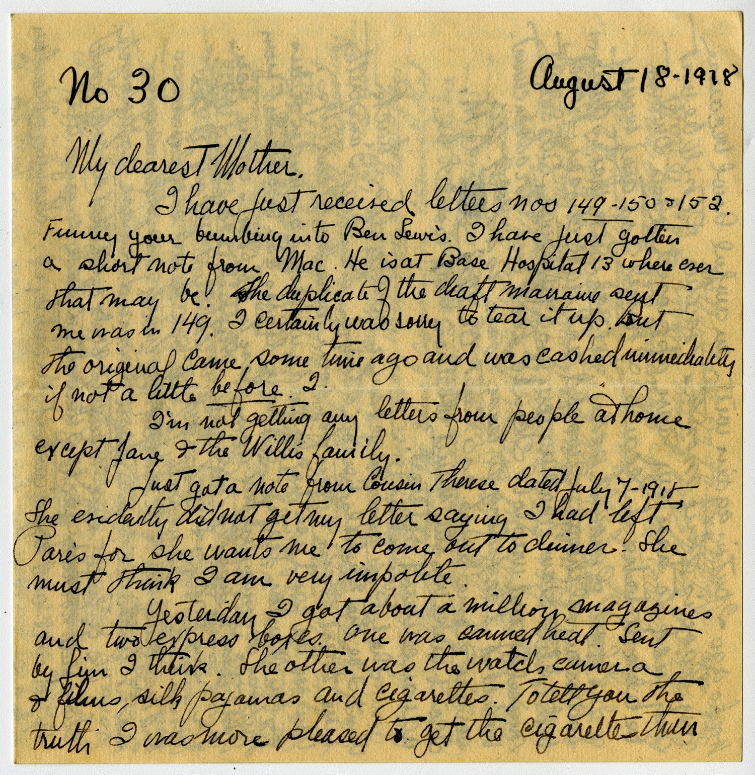 No 30 August 18 -1918. My dearest Mother. I have just received letters nos. 149