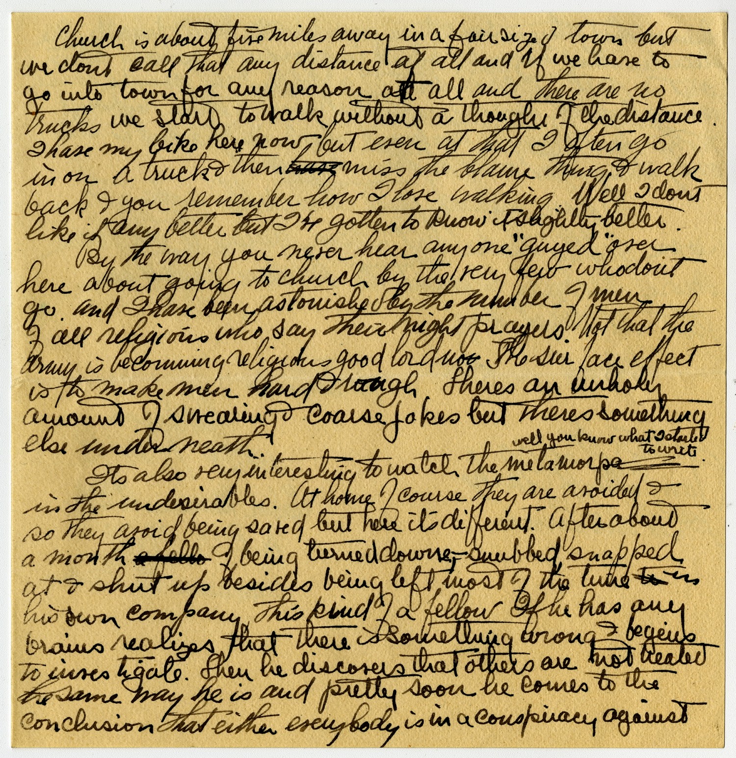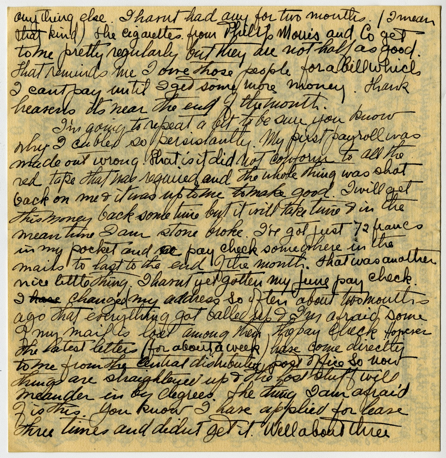 anything else. I havnt had any for two months. (I mean that kind) The cigarettes from Phillip Morris and Co get to me pretty regularly but they are not half as good. That reminds me I owe those people for a bill which I cant pay until I get some more money. Thank heavens its near the end of the month. I