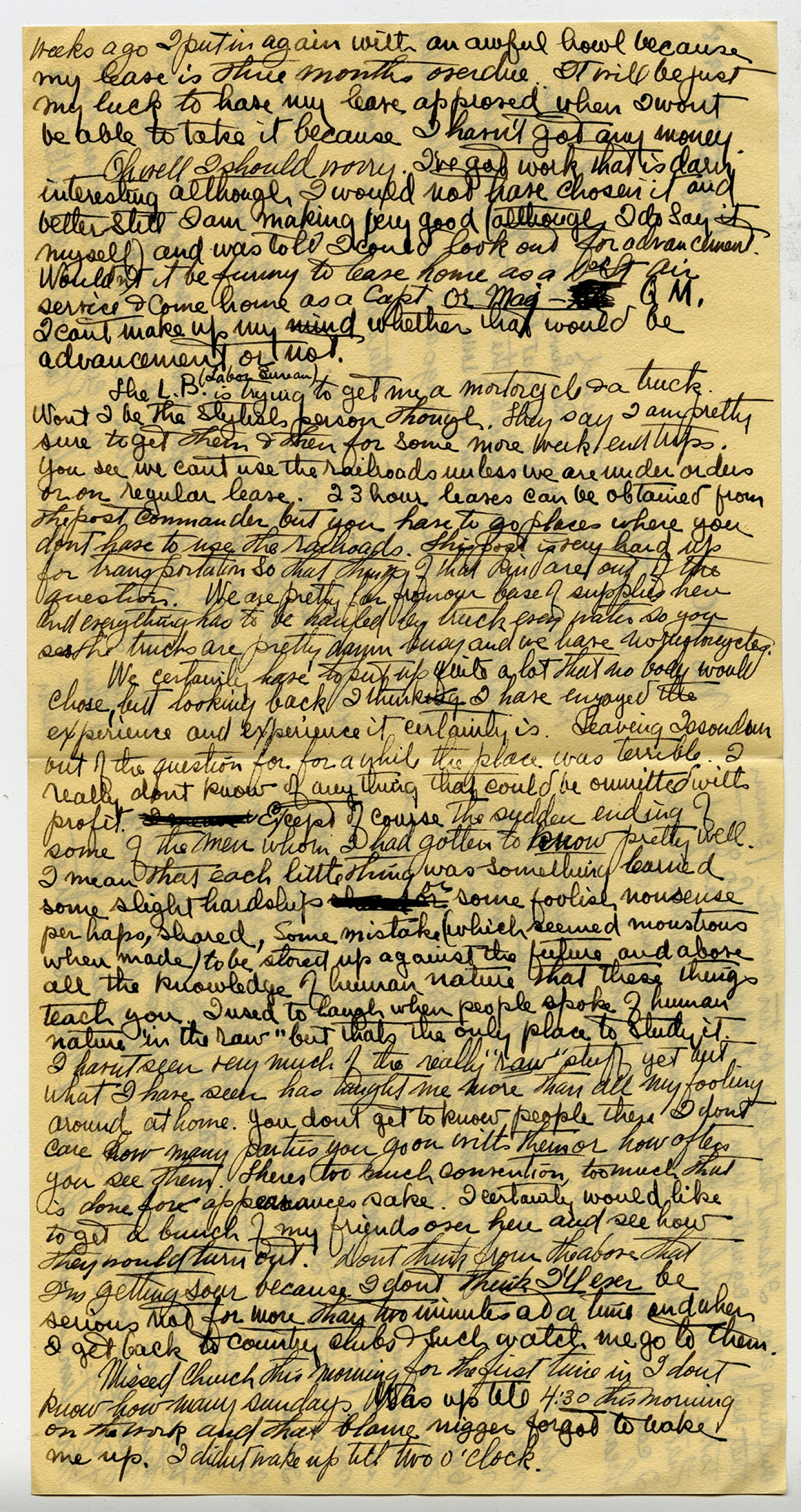 | Description | Powhatan H. Clarke wrote to his mother about his hardships in the Labor Bureau including lack of transportation and limited funds. Clarke served with the 21st Aero Squadron and Labor Bureau A.E.F. during Word War I. |