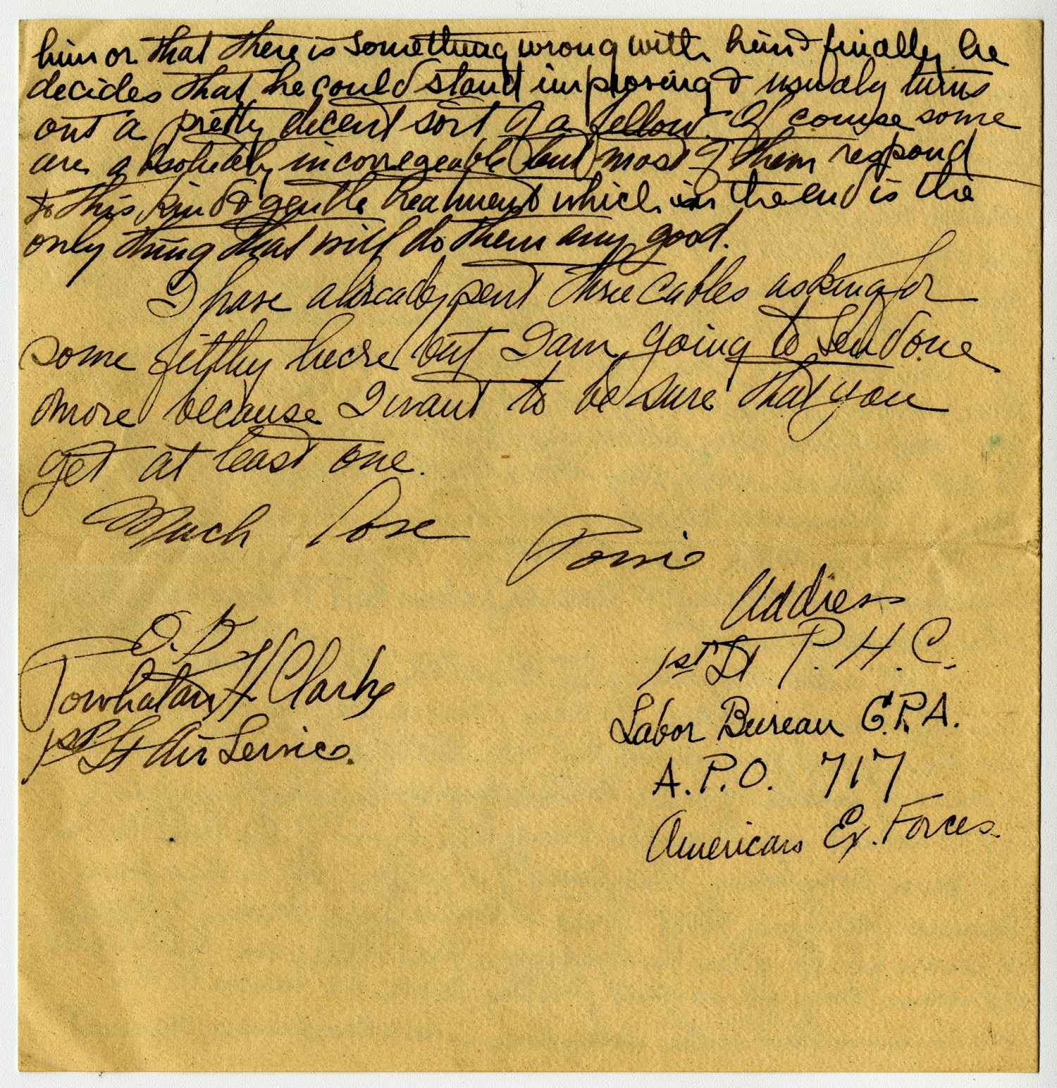 him or that there is something wrong with him & finally he decides that he could start improving and usually turns out a pretty decent sort of a fellow. Of course some are absolutely incorregeable but most of them respond to this kind of gentle treatment which in the end is the only thing that will do them any good. I have already sent three cables asking for some filthy [ms illegible: 1 wd] but I am going to send one more because I want to be sure that you get at least one. Much Love Powie O.K. Powhatan H. Clark 1st Lt Air Service Address Address1st Lt P.H.C. Labor Bureau G.P.A. A.P.O. 717 American Ex. Forces.